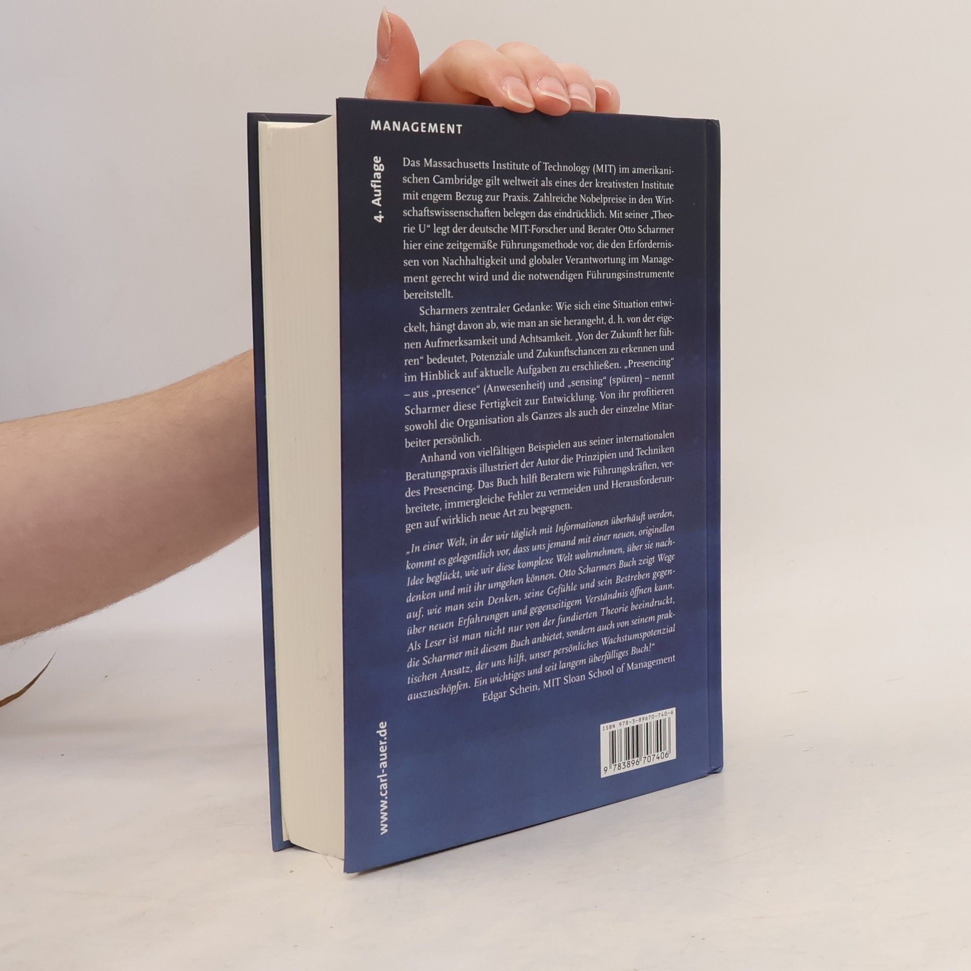 Das Massachusetts Institute of Technology (MIT) in Cambridge gilt als eines der kreativsten Institute weltweit, was sich unter anderem in sechs Nobelpreisen in den Wirtschaftswissenschaften widerspiegelt. An der MIT Sloan School of Management entstand Peter Senges „Die fünfte Disziplin“, die die Organisationsforschung und -beratung maßgeblich beeinflusste. Otto Scharmer, ein deutscher MIT-Forscher, entwickelte die „Theorie U“, eine zeitgemäße Führungsmethode, die den Anforderungen von Nachhaltigkeit und globaler Verantwortung im Management gerecht wird. Scharmers Kerngedanke ist, dass die Entwicklung einer Situation davon abhängt, wie man an sie herangeht, insbesondere durch Aufmerksamkeit und Achtsamkeit. „Von der Zukunft her führen“ bedeutet, Potenziale und Chancen zu erkennen und zu nutzen. „Presencing“ bezeichnet die Fähigkeit zur Entwicklung, von der sowohl Organisationen als auch Einzelpersonen profitieren. Scharmer illustriert in seinem Werk die Prinzipien und Techniken des Presencing anhand vielfältiger Beispiele aus seiner Beratungspraxis. Das Buch bietet Führungskräften und Beratern wertvolle Einsichten, um wiederkehrende Fehler zu vermeiden und Herausforderungen neu zu begegnen. Die Neuauflage enthält ein ausführliches Register. Scharmer wird von verschiedenen Persönlichkeiten gelobt, die die transformative Kraft seiner Theorie erkennen und ihre Relevanz für Reformen und Veränderungsprozesse betonen.