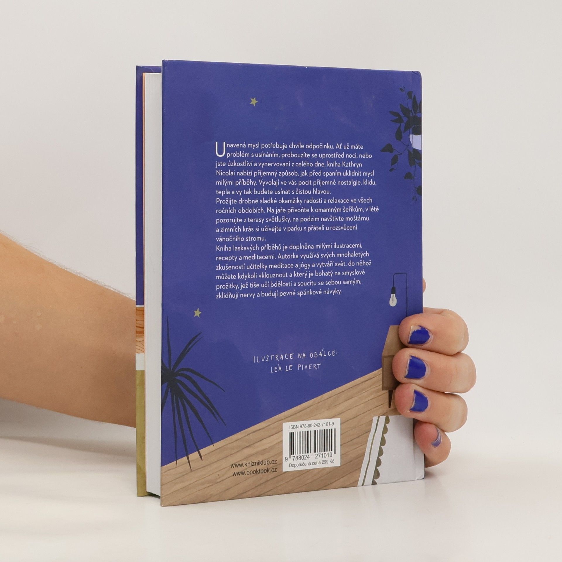 Soubor „pohádek“ nebo spíš krátkých vyprávění pro dospělé, jejichž tématem je docela obyčejný život, ve kterém se neděje nic dramatického ani závažného. Příběhy navodí uklidňující atmosféru a přispějí k lepšímu usínání. Po knize určitě sáhnete, když nemůžete usnout nebo se vzbudíte uprostřed noci a chcete myslet jen na poklidné výjevy, které vás zase ukolébají do spánku. Jen si představte, jak se vpodvečer zavírá přívětivé knihkupectví a všude je klidno. Jak se za deštivého dne přijde domů a na gauči si k vám přiskočí kotě a stulí se vám do klína. Jak se upeče chleba a uvaří marmeláda i pro sousedy. Jak se kupuje vánoční stromek. Příběhy oddělují stránky tu s receptem, tu s meditací nebo jógovým cvičením, někde zase návod na vystřihované ozdoby na stromeček. Ideální společník do uspěchaného života.