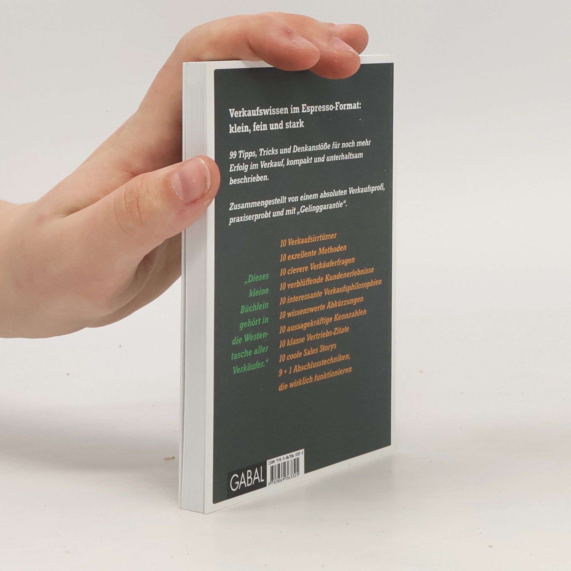 Ein Verkäuferbüchlein wie ein guter Espresso: klein, fein und stark. Zum schnellen Nachschlagen, Nachdenken und Spaß haben. Von Vermarktungsexperte Roger Rankel ausgewählt und kommentiert. Eine gute Geschenkidee für alle Menschen im Verkauf. Auf 10 mal 10 Seiten: Verkaufsmethoden, die funktionieren – Verkaufsmärchen, die sich hartnäckig halten – die ultimativen Fragen im Kundengespräch – die wichtigsten Kennzahlen für den Verkauf – die exotischsten Abkürzungen – die besten Verkäufersprüchen und vieles andere mehr. 99 Tipps, Tricks und Denkanstöße für noch mehr Erfolg im Verkauf, kompakt und unterhaltsam beschrieben. Zusammengestellt von einem absoluten Verkaufsprofi, praxiserprobt und mit „Gelinggarantie“.