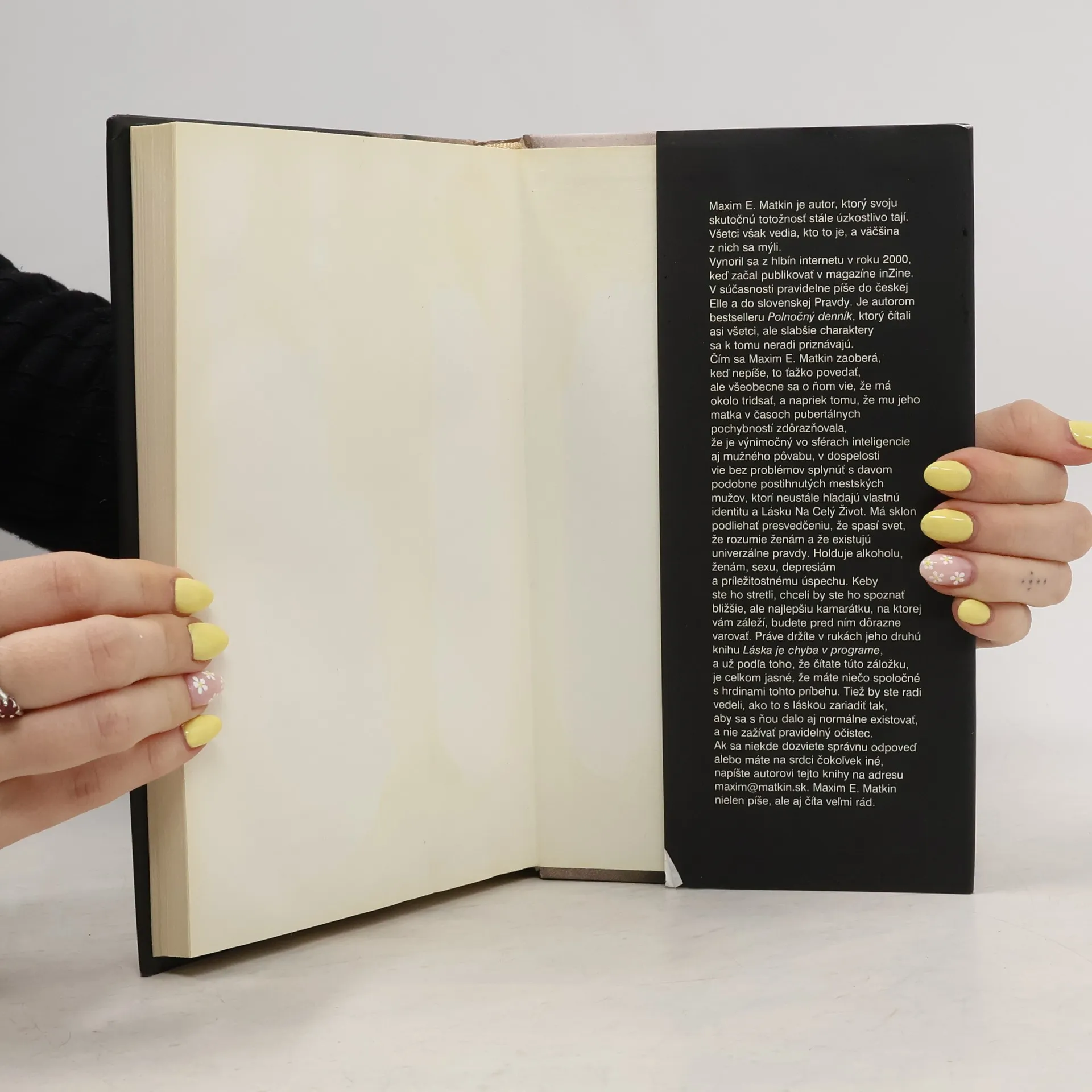 Prvý román Maxima E. Matkina Polnočný denník sa stal kultovým ešte pred vydaním. Okrem záverečnej kapitoly vyšiel na pokračovanie na www.inzine.sk a stal sa predmetom vášnivých diskusií. Kapitoly z knihy Láska je chyba v programe minulé leto vychádzali v denníku Pravda, ďalšie opäť na Inzine. Internetový magazín však zanikol, a tak si posledné kapitoly môžete prečítať až teraz. Matkin opäť dokazuje, že je dobrý pozorovateľ so zmyslom pre čierny humor a pointu. V románe Láska je chyba v programe tridsiatnik Stajpen rieši zložitý citový prepletenec so svojou priateľkou Zoe, s priateľkou svojho brata Korbena Sony a s expriateľkou Kimi. Popritom pomáha matke (ne)zostať s otcom a priateľovi Skalárovi (ne)zostať pri zdravom rozume, všetko podfarbené sarkastickými komentármi o živote, práci a láske. Štýl je ľahký, svieži a prudko čitateľný. Ženy sú krajšie a inteligentnejšie, muži citlivejší, rodičia trápnejší, sex búrlivejší a rozchody bolestnejšie ako v skutočnosti. Kniha Maxima E. Matkina Láska je chyba v programe je pravdivejšia ako život...