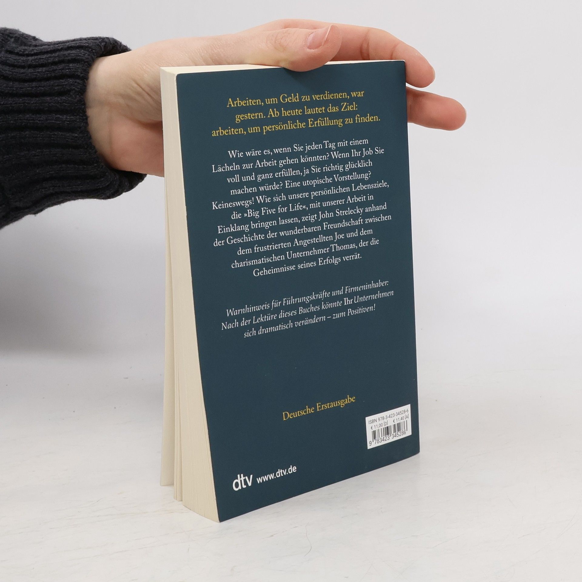 Arbeiten, um Geld zu verdienen, war gestern Durch Zufall lernt Joe, ein mit seinem Job unzufriedener Angestellter, den charismatischen Geschäftsmann Thomas kennen. Rasch entwickelt sich eine tiefe Freundschaft zwischen den beiden Männern. Thomas wird zu Joes Mentor und offenbart ihm die Geheimnisse seines Erfolgs. Er zeigt Joe, wie wichtig es ist, auch in der Arbeit erfüllt zu sein. Seine Unternehmen führt Thomas anhand zweier Leitlinien: Jeder Mitarbeiter muss seine Bestimmung sowie seine »Big Five for Life« kennen, also wissen, welche fünf Ziele er im Leben erreichen will. Diese Ideen helfen Joe, seine Wünsche zu verwirklichen. Doch Thomas will möglichst viele an seinem Wissen teilhaben lassen: Seine gesammelten Aufzeichnungen liegen hier vor Ihnen. Arbeiten, um Geld zu verdienen, war gestern. Ab heute lautet das Ziel: arbeiten, um persönliche Erfüllung zu finden.