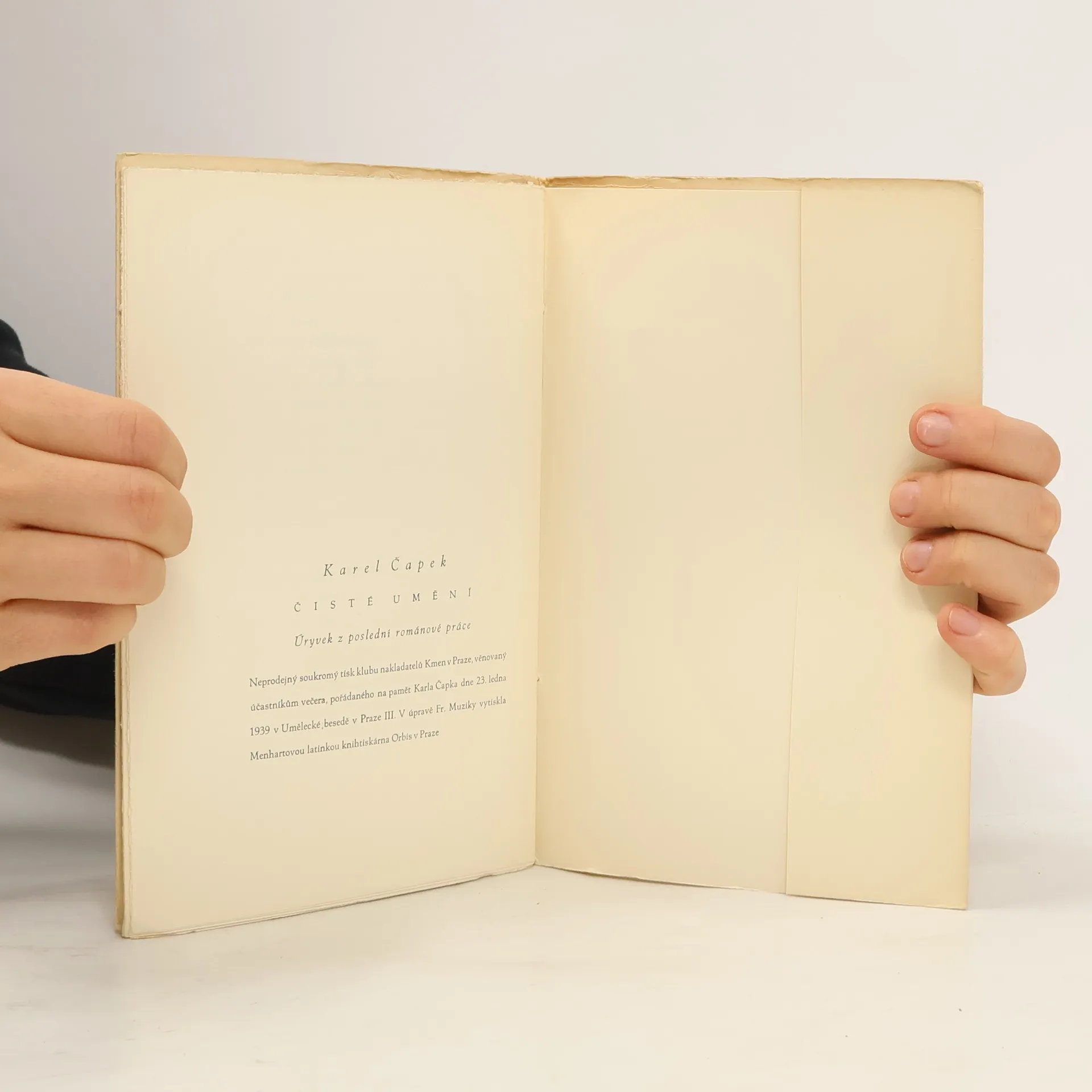 Úryvek z poslední románové práce. Neprodejný soukromý tisk Kmene, klubu nakladatelů v Praze, věnovaný účastníkům smuteční slavnosti, pořádané na paměť Karla Čapka.