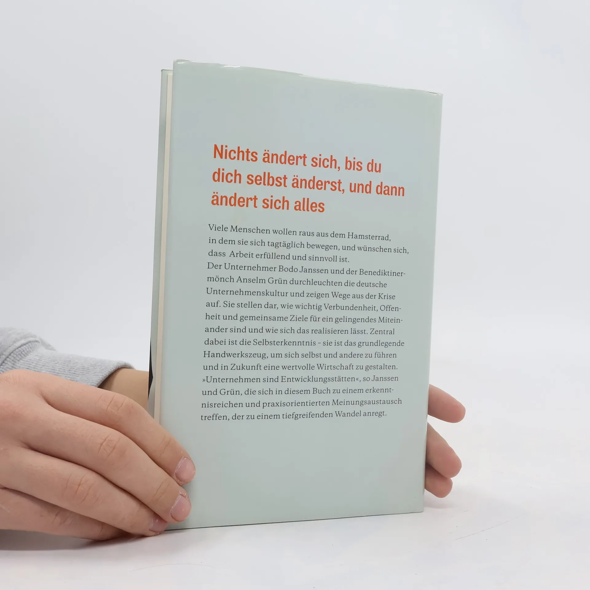 Nichts ändert sich, bis du dich selbst änderst, und dann ändert sich alles … Viele Menschen wollen raus aus dem Hamsterrad, in dem sie sich tagtäglich bewegen, und wünschen sich, dass Arbeit erfüllend und sinnvoll ist. Der Unternehmer Bodo Janssen und der Benediktinermönch Anselm Grün durchleuchten die deutsche Unternehmenskultur und zeigen Wege aus der Krise auf. Sie stellen dar, wie wichtig Verbundenheit, Offenheit und gemeinsame Ziele für ein gelingendes Miteinander sind und wie sich das realisieren lässt. Zentral dabei ist die Selbsterkenntnis – sie ist das grundlegende Handwerkszeug, um sich selbst und andere zu führen und in Zukunft eine wertvolle Wirtschaft zu gestalten. „Unternehmen sind Entwicklungsstätten“, so Janssen und Grün, die sich in diesem Buch zu einem erkenntnisreichen und praxisorientierten Meinungsaustausch treffen, der zu einem tiefgreifenden Wandel anregt.