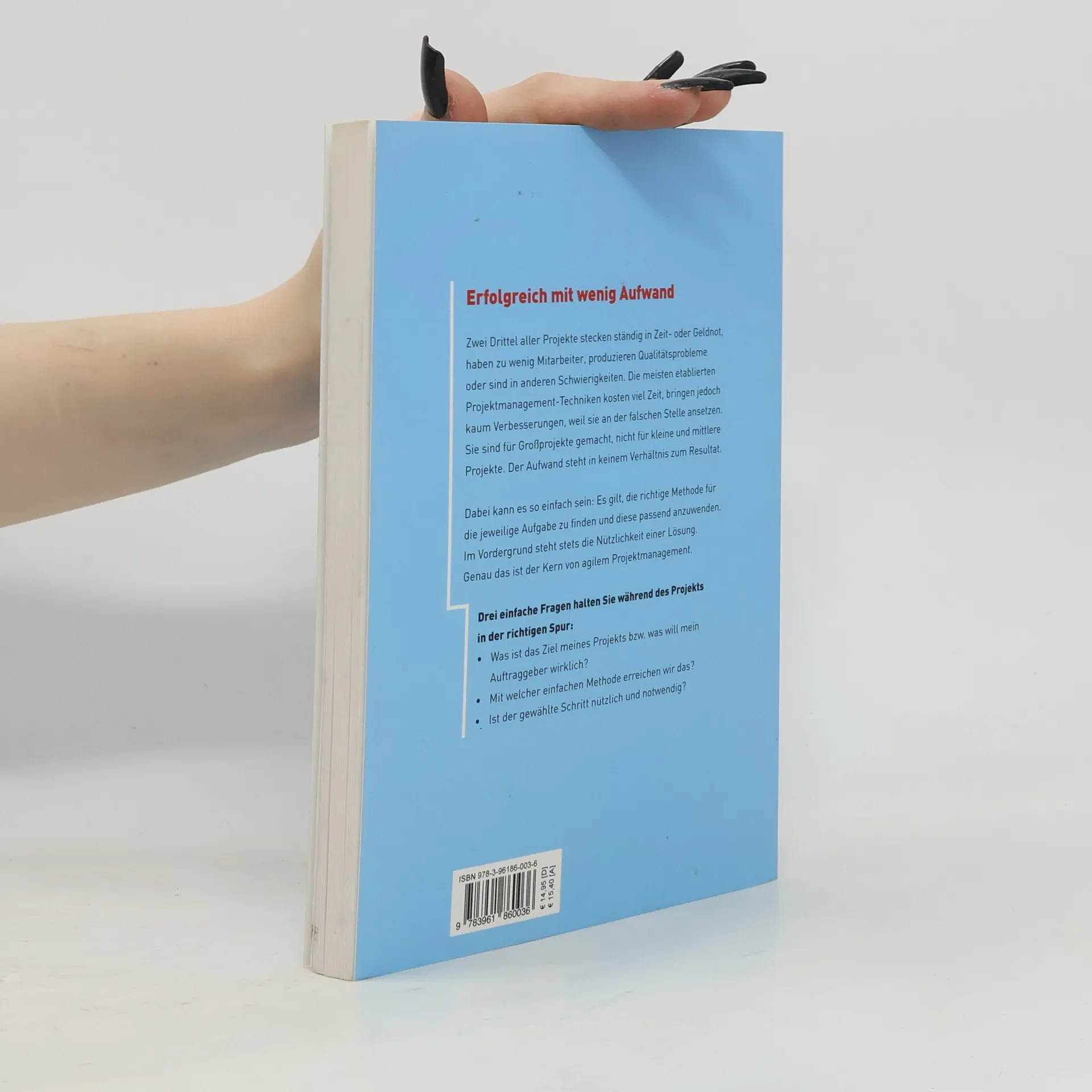 Erfolgreich mit wenig Aufwand Zwei Drittel aller Projekte stecken ständig in Zeit- oder Geldnot, haben zu wenig Mitarbeiter, produzieren Qualitätsprobleme oder sind in anderen Schwierigkeiten. Die meisten etablierten Projektmanagement-Techniken kosten viel Zeit, bringen jedoch kaum Verbesserungen, weil sie an der falschen Stelle ansetzen. Sie sind für Großprojekte gemacht, nicht für kleine und mittlere Projekte. Der Aufwand steht in keinem Verhältnis zum Resultat. Dabei kann es so einfach sein: Es gilt, die richtige Methode für die jeweilige Aufgabe zu finden und diese passend anzuwenden. Im Vordergrund steht stets die Nützlichkeit einer Lösung. Genau das ist der Kern von agilem Projektmanagement. Was ist das Ziel meines Projekts bzw. was will mein Auftraggeber wirklich? Mit welcher einfachen Methode erreichen wir das? Ist der gewählte Schritt nützlich und notwendig?