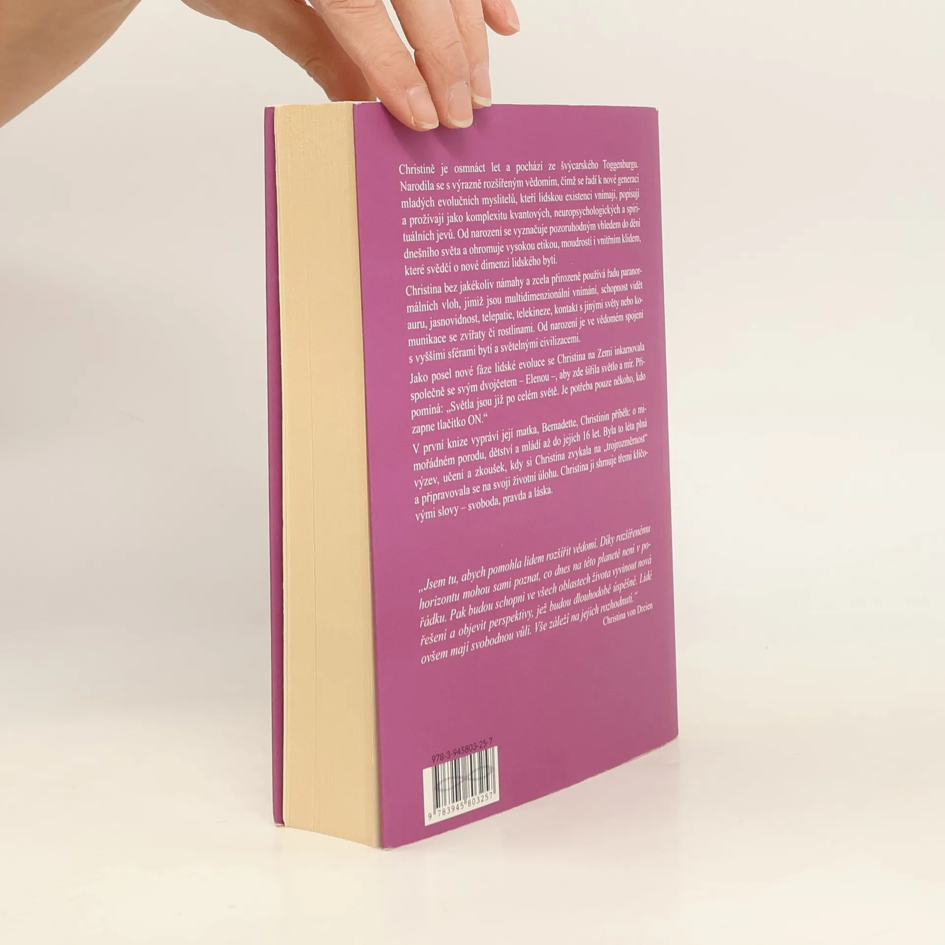 Christině je osmnáct let a pochází ze švýcarského Toggenburgu. Narodila se s výrazně rozšířeným vědomím, což ji řadí k nové generaci mladých evolučních myslitelů, kteří lidskou existenci vnímají jako komplexitu kvantových, neuropsychologických a spirituálních jevů. Vyniká vhledem do dění dnešního světa, vysokou etikou, moudrostí a vnitřním klidem, které svědčí o nové dimenzi lidského bytí. Christina přirozeně používá paranormální vlohy, jako je multidimenzionální vnímání, schopnost vidět auru, jasnovidnost, telepatie, telekineze a komunikace s jinými světy. Je ve vědomém spojení s vyššími sférami bytí a světelnými civilizacemi. Jako posel nové fáze lidské evoluce se inkarnovala spolu se svým dvojčetem Elenou, aby šířila světlo a mír. Její matka, Bernadette, vypráví o jejím mimořádném porodu, dětství a mládí do 16 let, plném výzev a učení, kdy si Christina zvykala na „trojrozměrnost“ a připravovala se na svoji životní úlohu. Shrnuje ji třemi klíčovými slovy – svoboda, pravda a láska. Kniha obsahuje různé kapitoly, které pokrývají její příběh, kritickou analýzu doby, celostní medicínu, výjimečné vnímání, vzdělávací systém budoucnosti a další aspekty života a schopností Christiny.