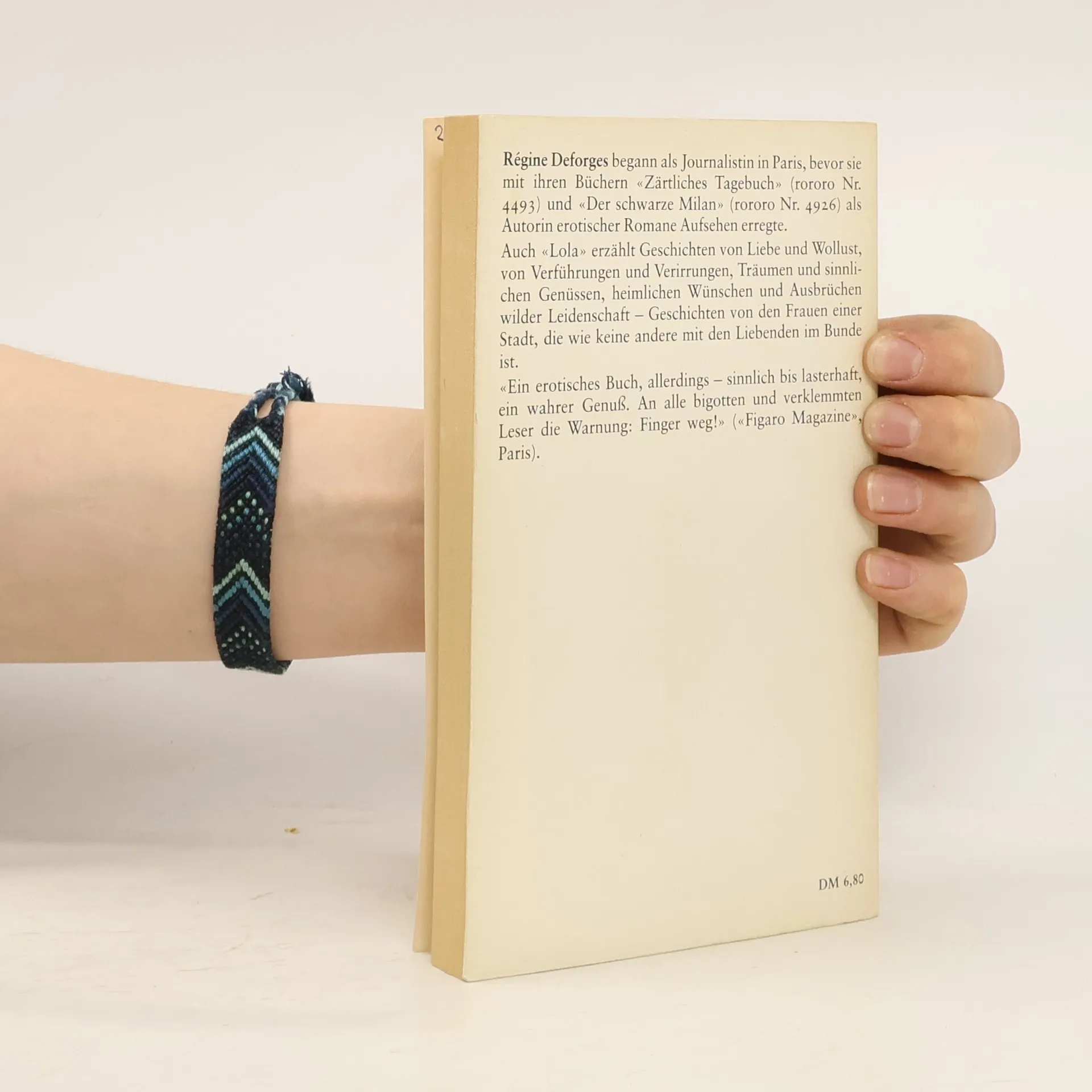 Régine Deforges (1935–2014) begann als Journalistin in Paris, bevor sie mit ihren Büchern «Die O hat mir erzählt», «Lola», «Zärtliches Tagebuch» und »Der schwarze Milan« als Autorin erotischer Romane einiges Aufsehen erregte.