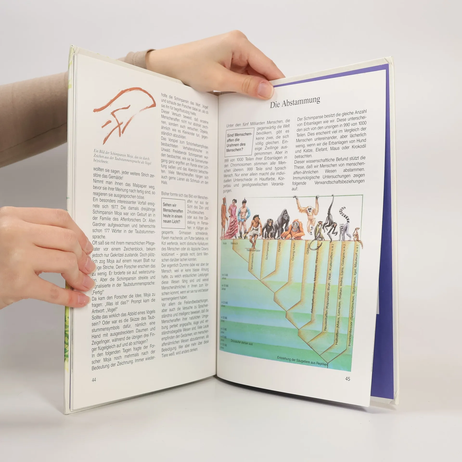 Welche Werkzeuge benutzen Schimpansen? Wozu ist das Lausen gut? Können Menschenaffen mit Menschen sprechen? Der Sachbuchautor Vitus B. Dröscher bringt uns die faszinierende Welt der Menschenaffen - der Schimpansen, Bonobos, Gorillas und Orang-Utans - nahe. Er berichtet über ihre Lebensweise und ihr Verhalten, ihre hohe Intelligenz, ihr Sprachvermögen und ihr ausgeprägtes Mienenspiel. Eindringlich weist er auf die Gefahren hin, denen die Menschenaffen durch die Zerstörung ihres Lebensraumes und durch Wilderei ausgesetzt sind.