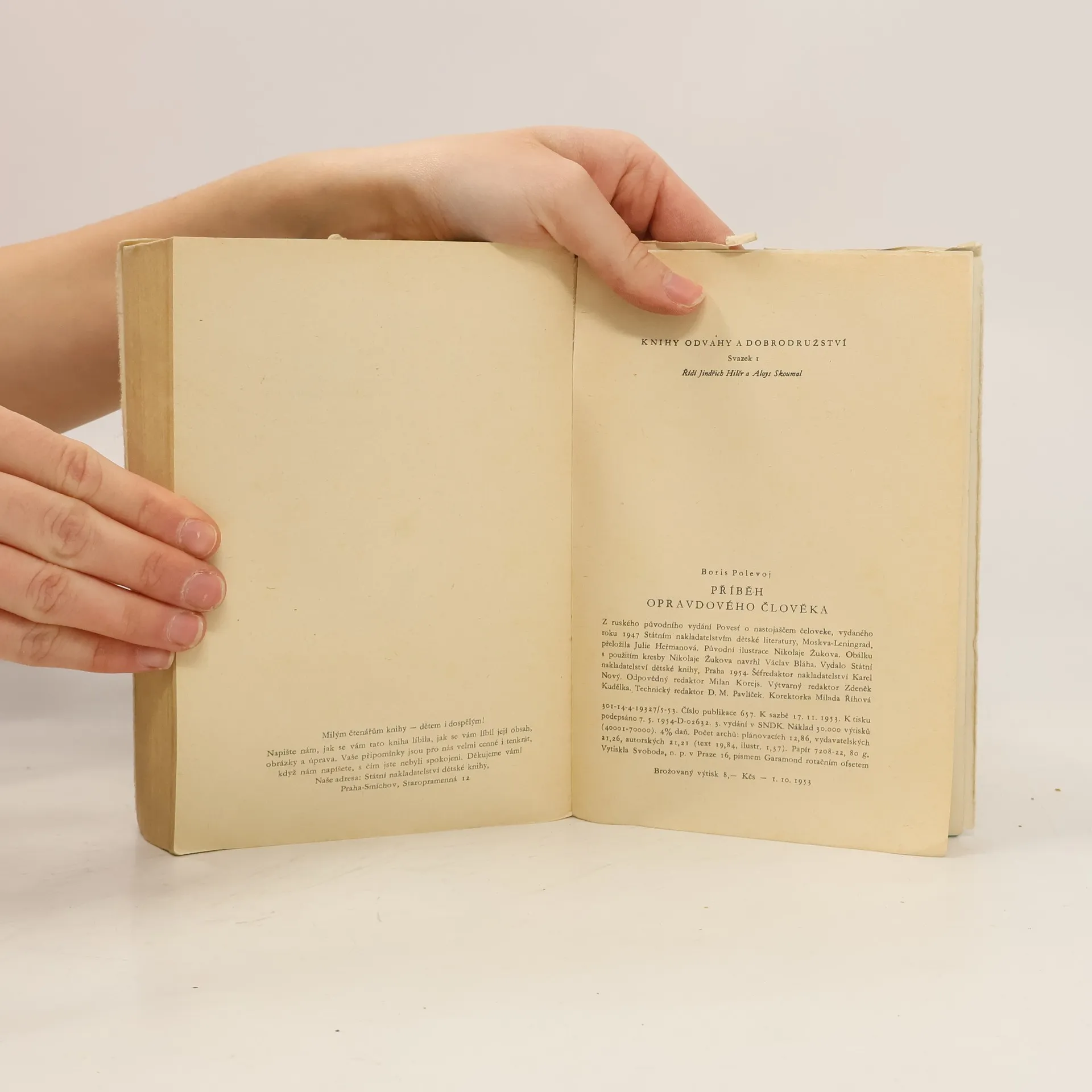 Kniha byla napsána podle skutečného příběhu, který se udál za Velké vlastenecké války. Nadporučík letectva Meresjev se po nerovném boji s nepřítelem ocitá s rozdrcenýma nohama daleko v týlu fronty. Po nesmírné námaze téměř třítýdenního putování dostane se do nemocnice, kde mu jsou amputovány obě nohy. Po překonání dočasné deprese rozhoduje se Meresjev, že se stůj co stůj opět stane stíhacím letcem. Po dlouhé, neobyčejně houževnaté přípravě ovládá Meresjev své protézy tak, že může i tančit. Jeho nadřízení pokládají za absurdnost, aby byl stíhačem beznohý, ale nakonec je jeho přání splněno. Román končí leteckým bojem, v němž Meresjev sestřeluje tři nacistická letadla. Vůle sovětského člověka přemohla všechny překážky. - Pro mládež přeloženo z ruského vydání z r. 1947. - Jaroslav Závada: Kdo je Boris Polevoj (doslov). knížka je z edice : KOD, číslo : 1 Ilustroval: Žukov
