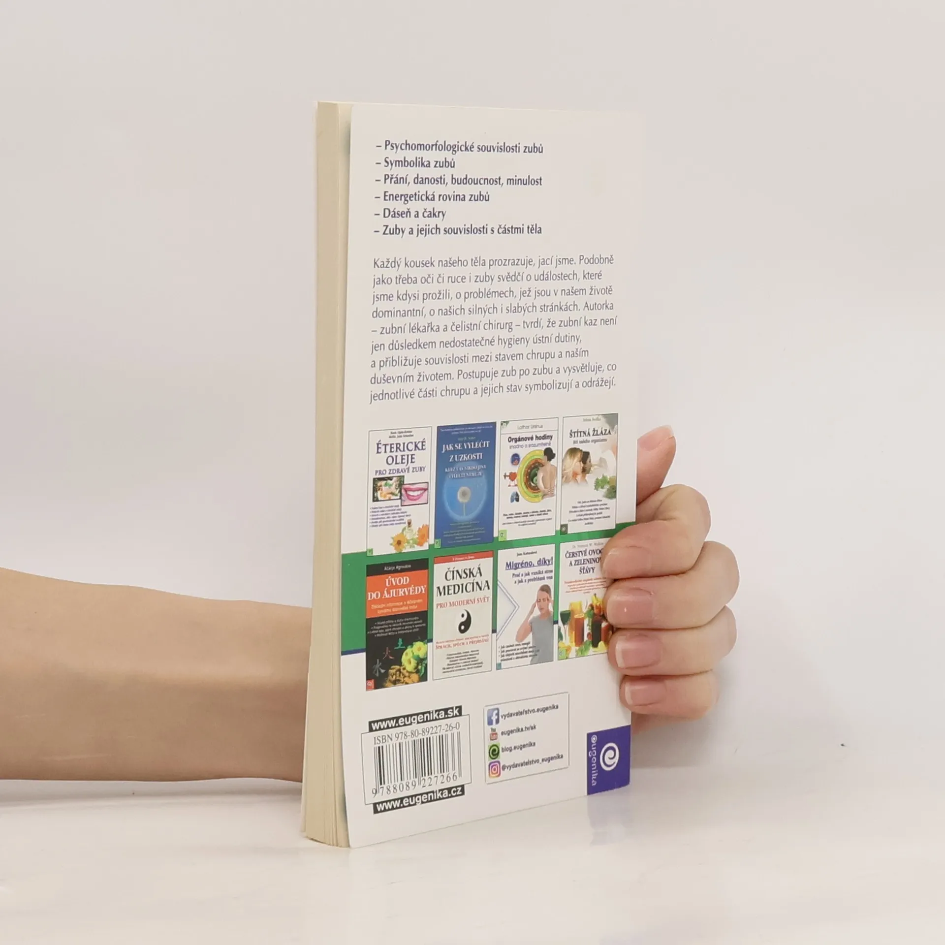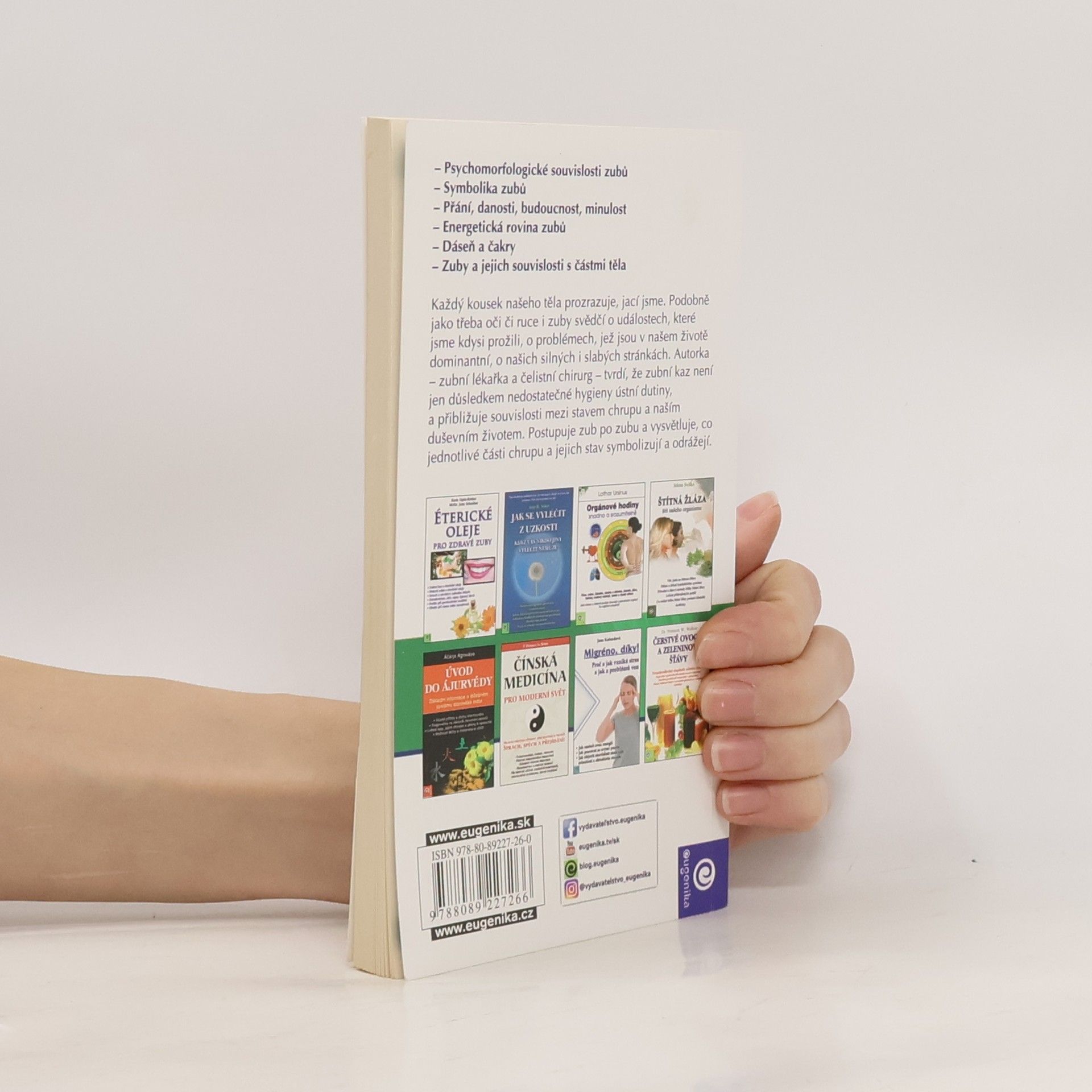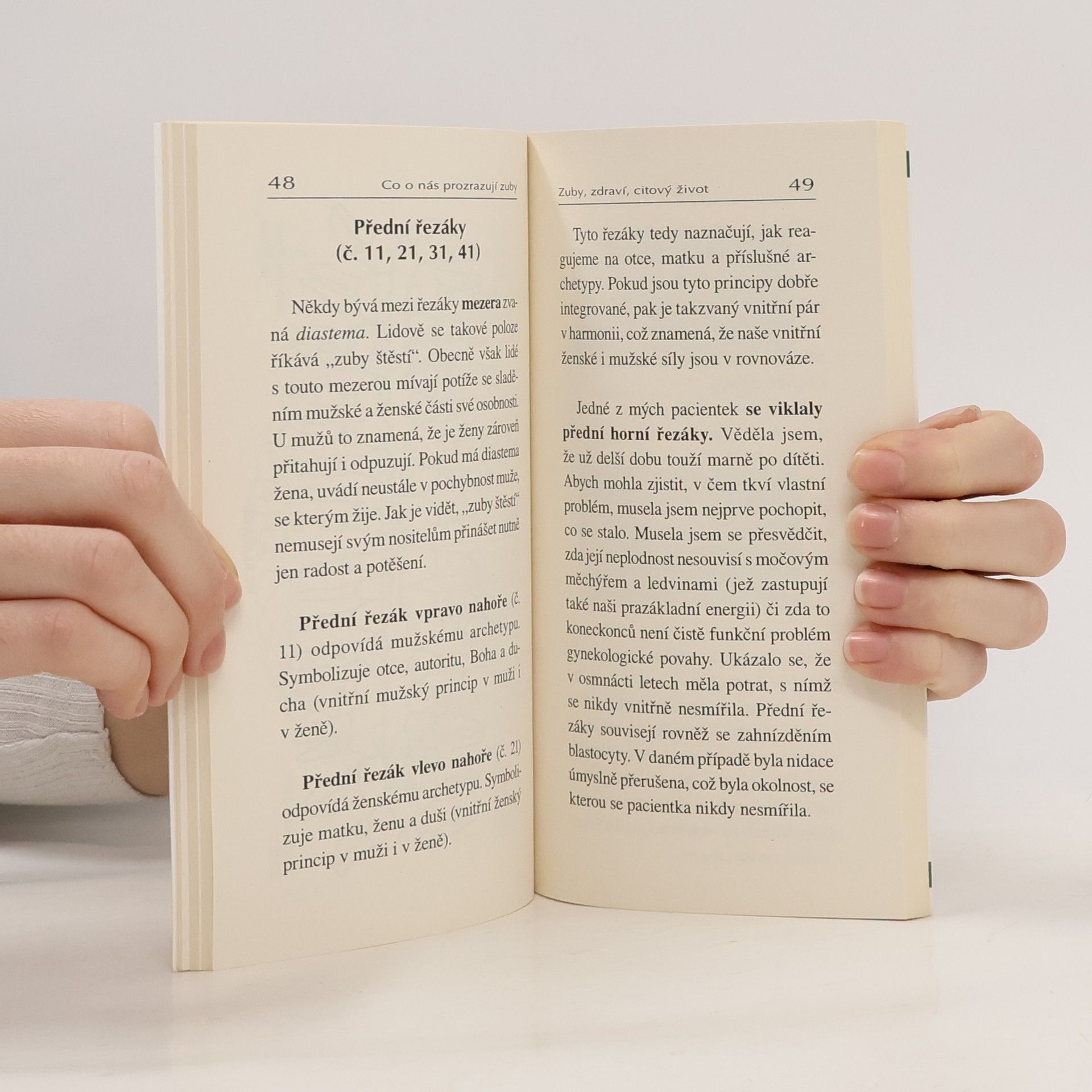 Zuby jsou zrcadlem našeho tělesného i duševního zdraví. Ukládají se v nich vzpomínky na prožité události a traumata. Autorka - zubní lékařka tvrdí, že zubní kaz odráží vztahy mezi stavem našeho chrupu a naším citovým životem. Vysvětluje, co znamenají kazy a různé vady na jednotlivýchzubech.