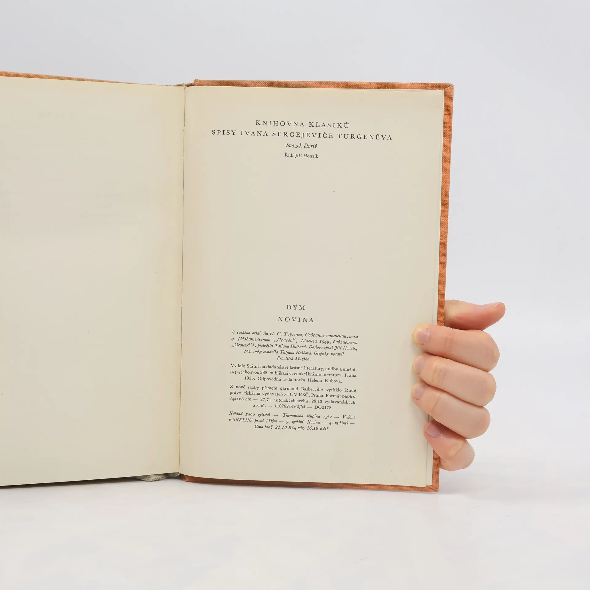 V obou svých posledních románech Turgeněv vylíčil typy revoluční raznočinecké inteligence. V Dýmu (1867), v němž se proplétá milostná zápletka s politickým pamfletem, vytvořil karikaturu na vojenskou špičku reakční aristokracie a na skupinu ruských revolucionářů, působících v emigraci, své společenské i politické krédo vyjádřil ústy Potugina, raznočince oddaného západní kultuře a západní civilizaci. V Novině (1877) Turgeněv zobrazil neúspěch národnictví, které však odsuzoval s posic liberální šlechty. Ústřední postavou i románu – a podle autorova názoru též mužem budoucnosti – je prostý, prakticky založený Solomin, představitel buržoazního a obchodně průmyslového Ruska, který se snaží zlepšit postavení lidu reformami, osvětovou prací a technickým pokrokem. Doslov napsal Jiří Honzík.