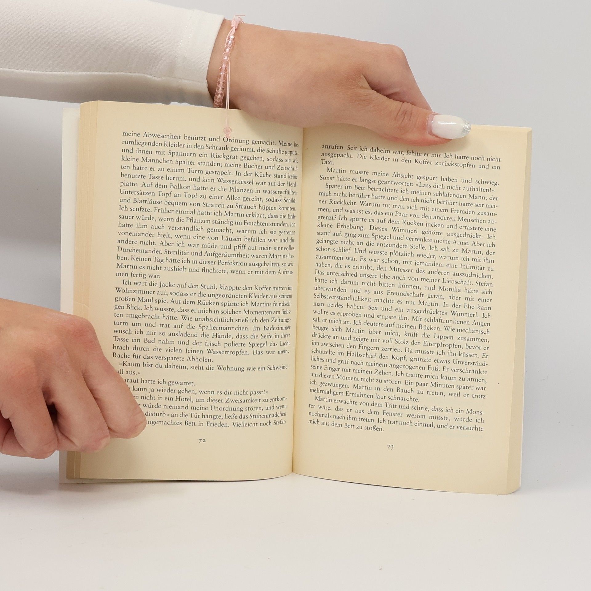 Eine Frau behandelt die Männer so, wie viele Männer Frauen behandeln. Sie ist verheiratet, aber zu jedem Abenteuer bereit. Da kommt ihr der attraktive Stefan gerade recht. Er hat nur einen Fehler: Er ist nicht verheiratet und fühlt sich bald von ihr als Lustobjekt missbraucht und drängt sie, sich von ihrem Mann zu trennen. Sie vergleicht Liebhaber und Ehemann, wägt ab. Was würde sich ändern, wenn sie den Mann austauschte? Sie würde sich ein neues Abenteuer suchen. Mit seiner fordernden Haltung wird Stefan ihr lästig. Sie gibt ihn an eine Freundin weiter und erhört einen anderen. Der ist unattraktiv, aber fanatisch und herrlich verrückt. Ein Terrorist, denn mehr, als von einem Mann begehrt zu werden, fasziniert sie die Frage, ob er ein potentieller Mörder ist. Auch der Terrorist will bald mehr. Sie flüchtet in eine rasche Affäre. Der Kurzliebhaber reagiert gekränkt, als sie nach dem Sex sofort gehen will. Welcher Mann möchte schon so behandelt werden. Sie geht nach Hause, wo niemand sie erwartet. Sie hat ein ruhiges Wochenende vor sich, ganz für sich allein.