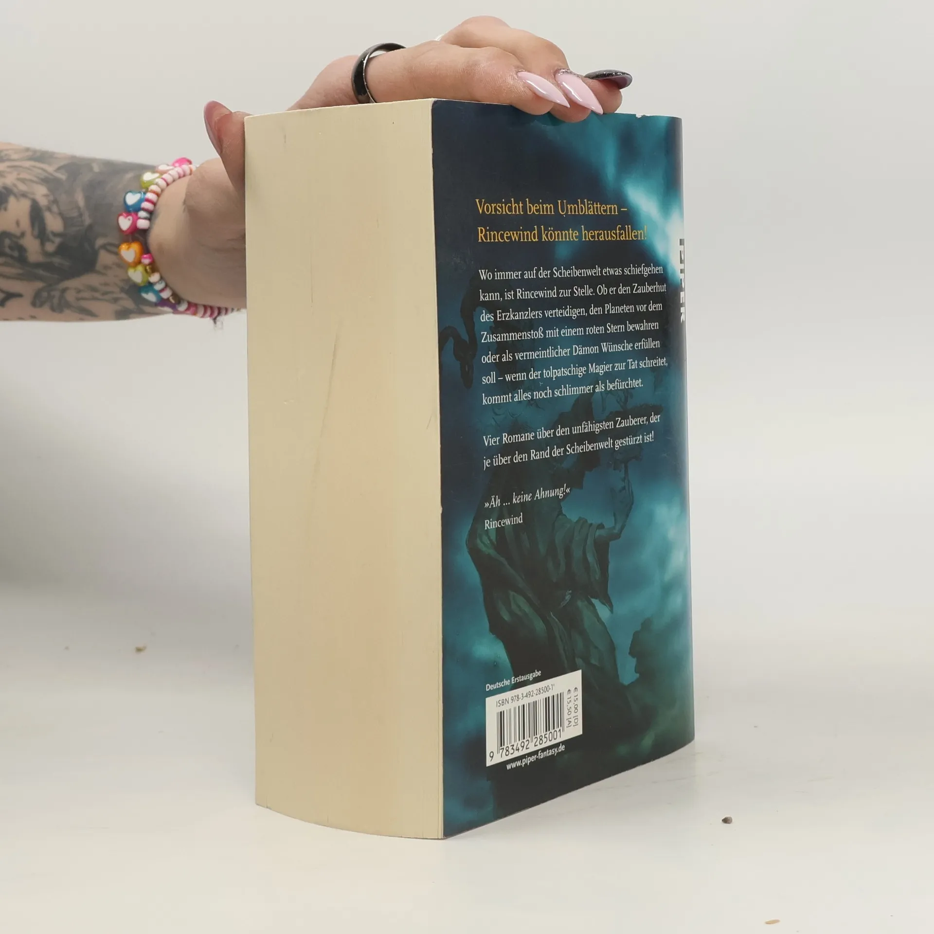 Der tollpatschigste Scheibenwelt-Sammelband aller Zeiten: Vorsicht beim Umblättern, Rincewind könnte herausfallen! Jeder, der mit dem chaotischen Zauberer Rincewind zu tun hatte, wünscht sich, einmal mit Profis zu arbeiten. In diesem Sammelband wird der gescheiterte Zauberer durch vier große Abenteuer geschickt. Seine Biografie? Fragwürdig. Seine magischen Talente? Unruhe stiften. Seine Geschichte? Unfassbar witzig! Rincewind gehört zu den schillerndsten Figuren in Terry Pratchetts Fantasy-Reihe und erfreut sich großer Beliebtheit. Die vier wichtigsten Abenteuer sind vereint: »Die Farben der Magie«, »Das Licht der Phantasie«, »Der Zauberhut« und »Eric«. »Die Farben der Magie« ist der Auftakt der Zauberer-Geschichten und gleichzeitig der erste Band der Scheibenwelt-Reihe, auf die die drei weiteren Erzählungen direkt aufbauen. Dieser Sammelband ist somit der perfekte Einstieg in die Scheibenwelt-Fantasy. Wie es sich trotz totaler Ahnungslosigkeit als Held unzähliger großartiger Geschichten lebt, erkunden Sie hier auf preisgünstige Weise. Terry Pratchetts 41 Scheibenwelt-Romane sind unerreichte Klassiker der humorvollen Fantasy und ein beispielloser internationaler Erfolg. Bei seinem Tod 2015 standen die Verkaufszahlen bei rund 45 Millionen Büchern, und täglich kommen neue Fans hinzu.