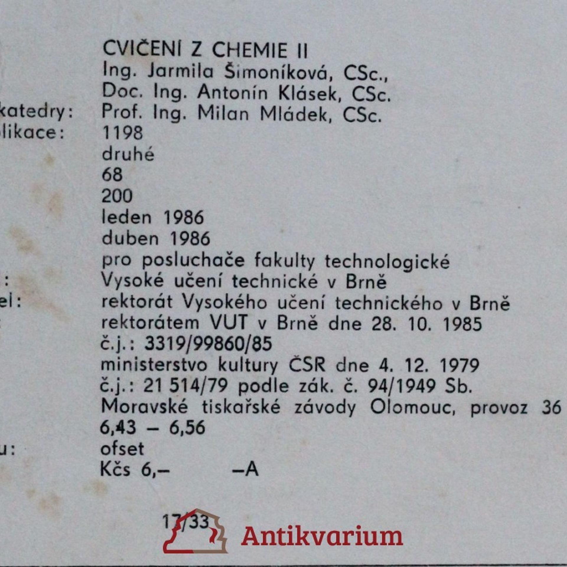 Cvičení z chemie II : Určeno pro posl. fak. technologické, Jarmila Šimoníková, Antonín Klásek