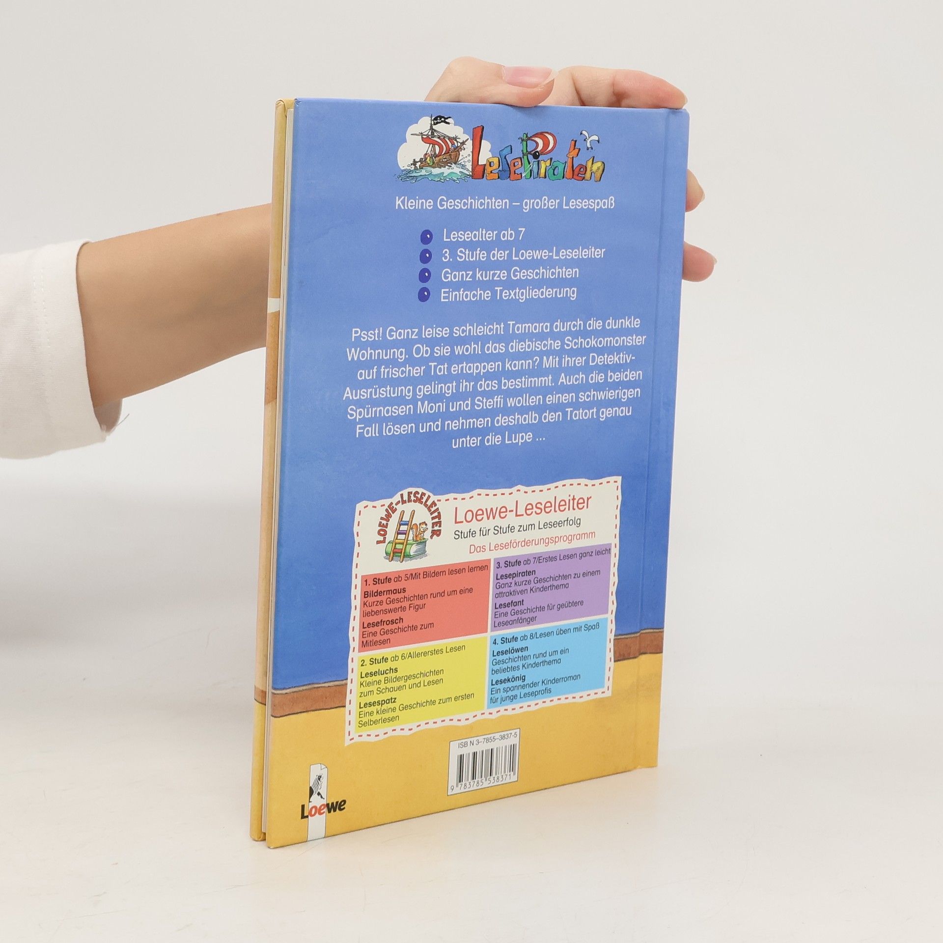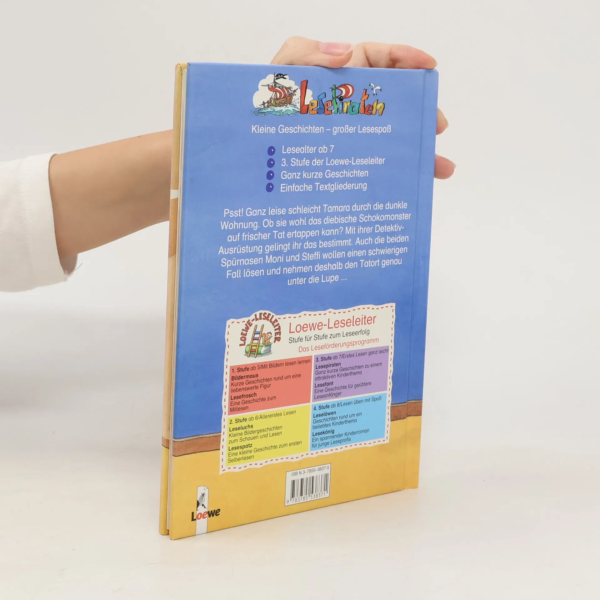 Lesealter ab 7 3. Stufe der Loewe-Leseleiter Ganz kurze Geschichten Einfache Textgliederung Psst! Ganz leise schleicht Tamara durch die dunkle Wohnung. Ob sie wohl das diebische Schokomonster auf frischer Tat ertappen kann? Mit ihrer Detektiv-Ausrüstung gelingt ihr das bestimmt. Auch die beiden Spürnasen Moni und Steffi wollen einen schwierigen Fall lösen und nehmen deshalb den Tatort genau unter die Lupe.