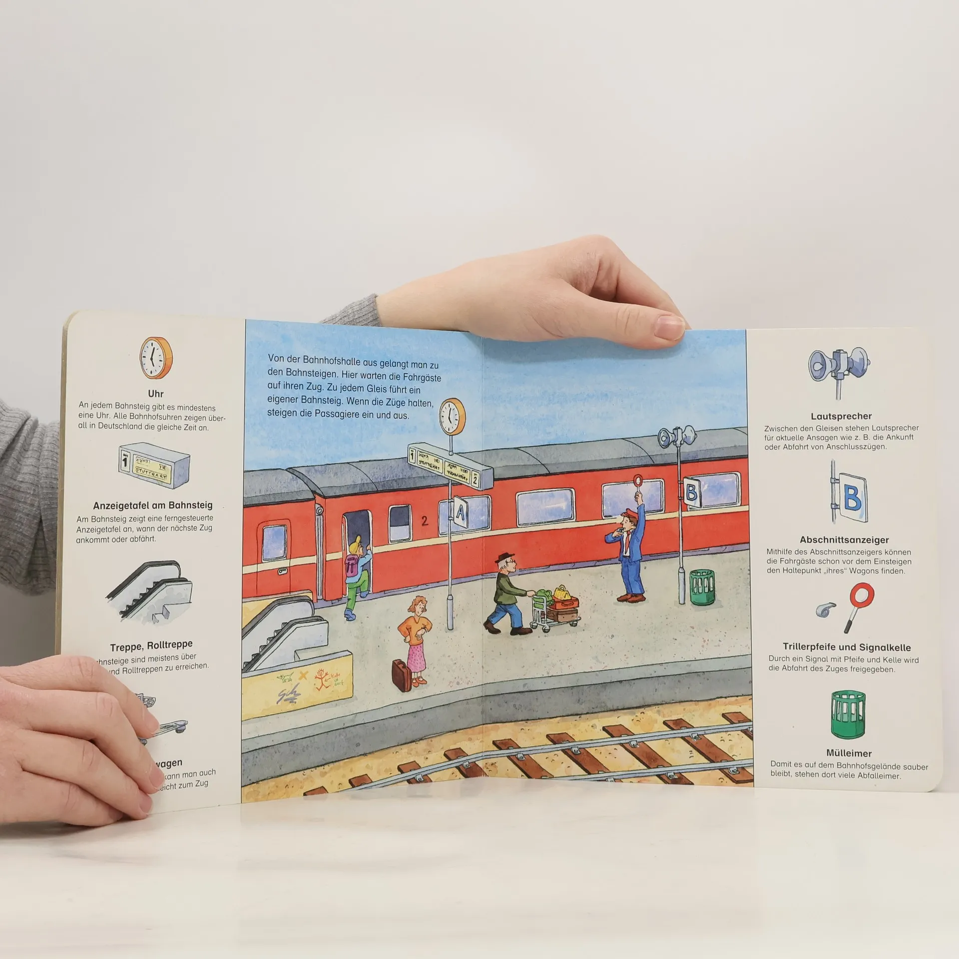 Auf dem Bahnhof herrscht ein geschäftiges Treiben, im Stellwerk werden die Weichen gestellt und im Speisewagen lassen es sich die Passagiere gut gehen. Alles Wissenswerte rund um die Eisenbahn wird auf elf Doppelseiten anschaulich illustriert und durch nochmalige Erklärungen an den Bildrändern weiter verdeutlicht. Ein Kindersachbuch zum Einsteigen und Abfahren.