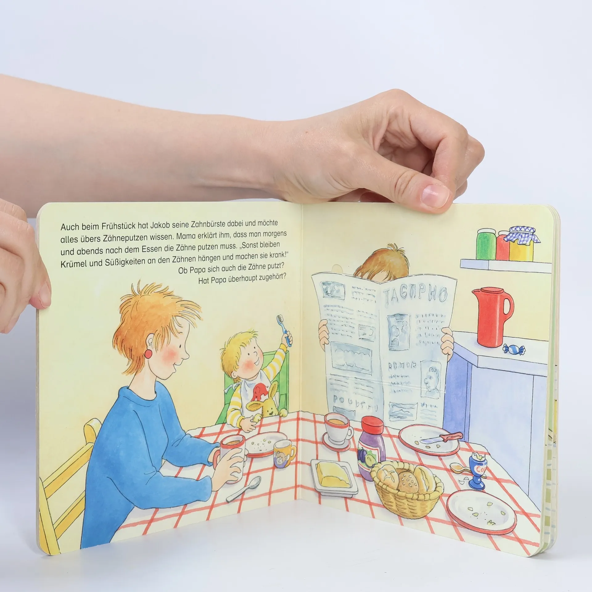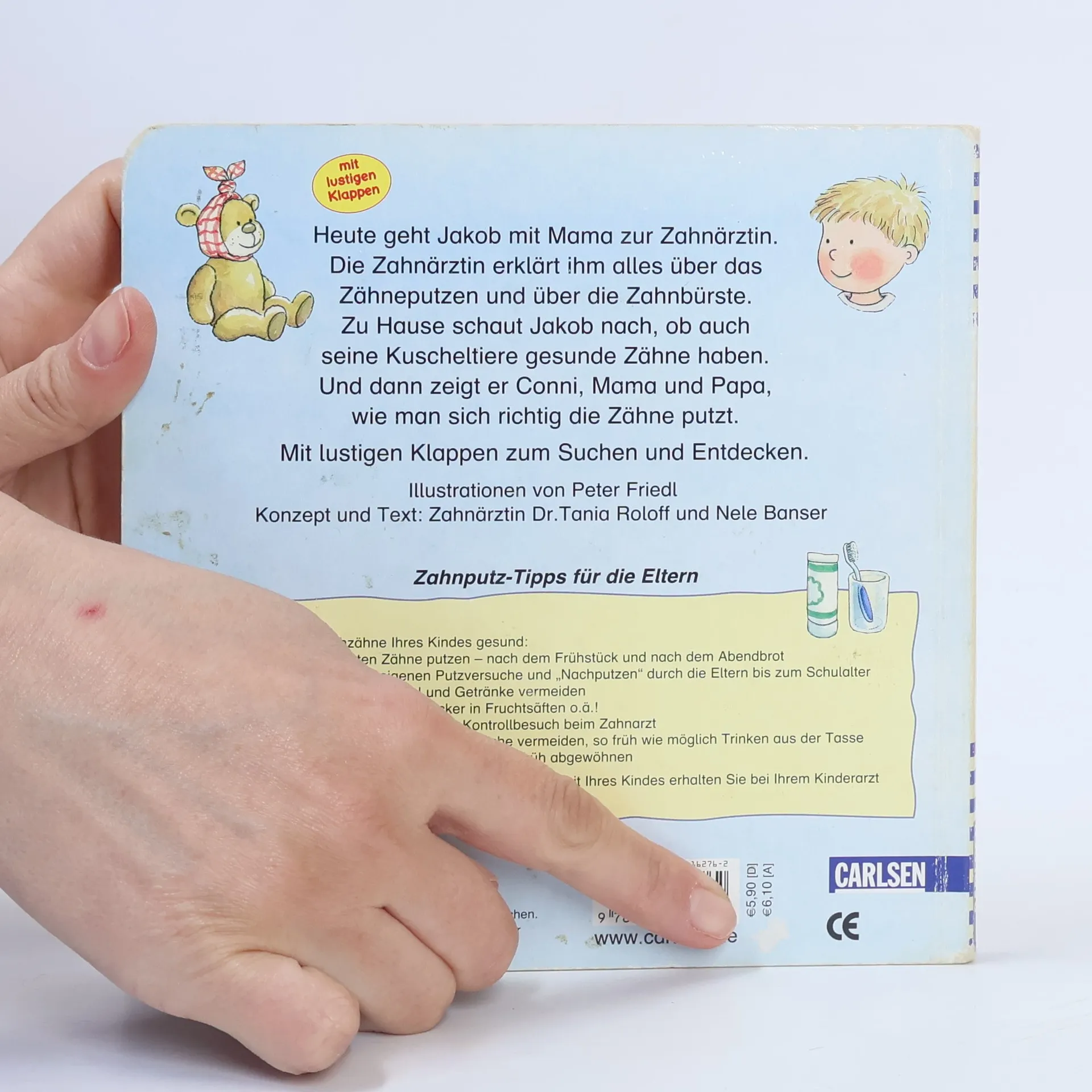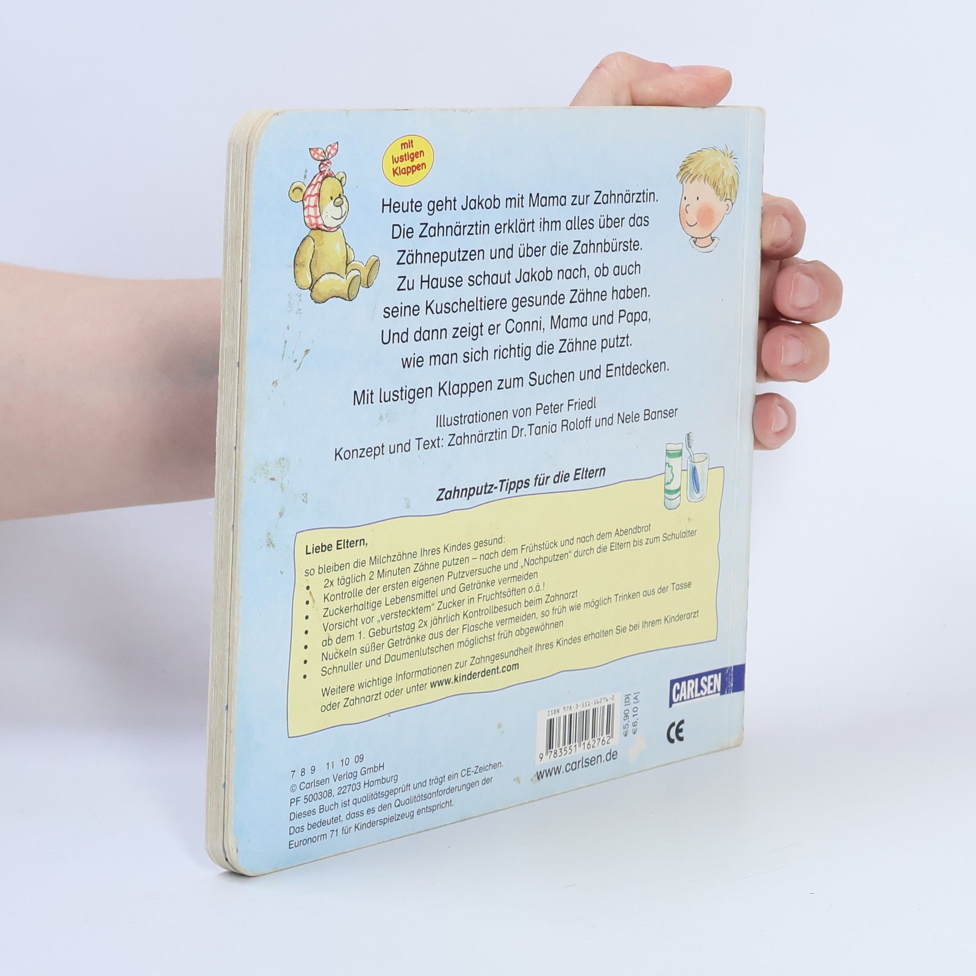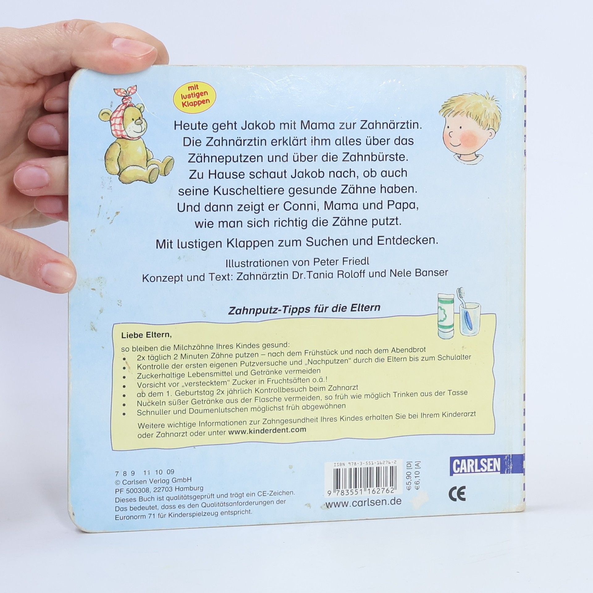 Heute geht Jakob mit Mama zur Zahnärztin. Die Zahnärztin erklärt ihm alles über das Zähneputzen und über die Zahnbürste. Zuhause schaut Jakob nach, ob auch seine Kuscheltiere gesunde Zähne haben. Und dann zeigt er Conni, Mama und Papa, wie man sich richtig die Zähne putzt.