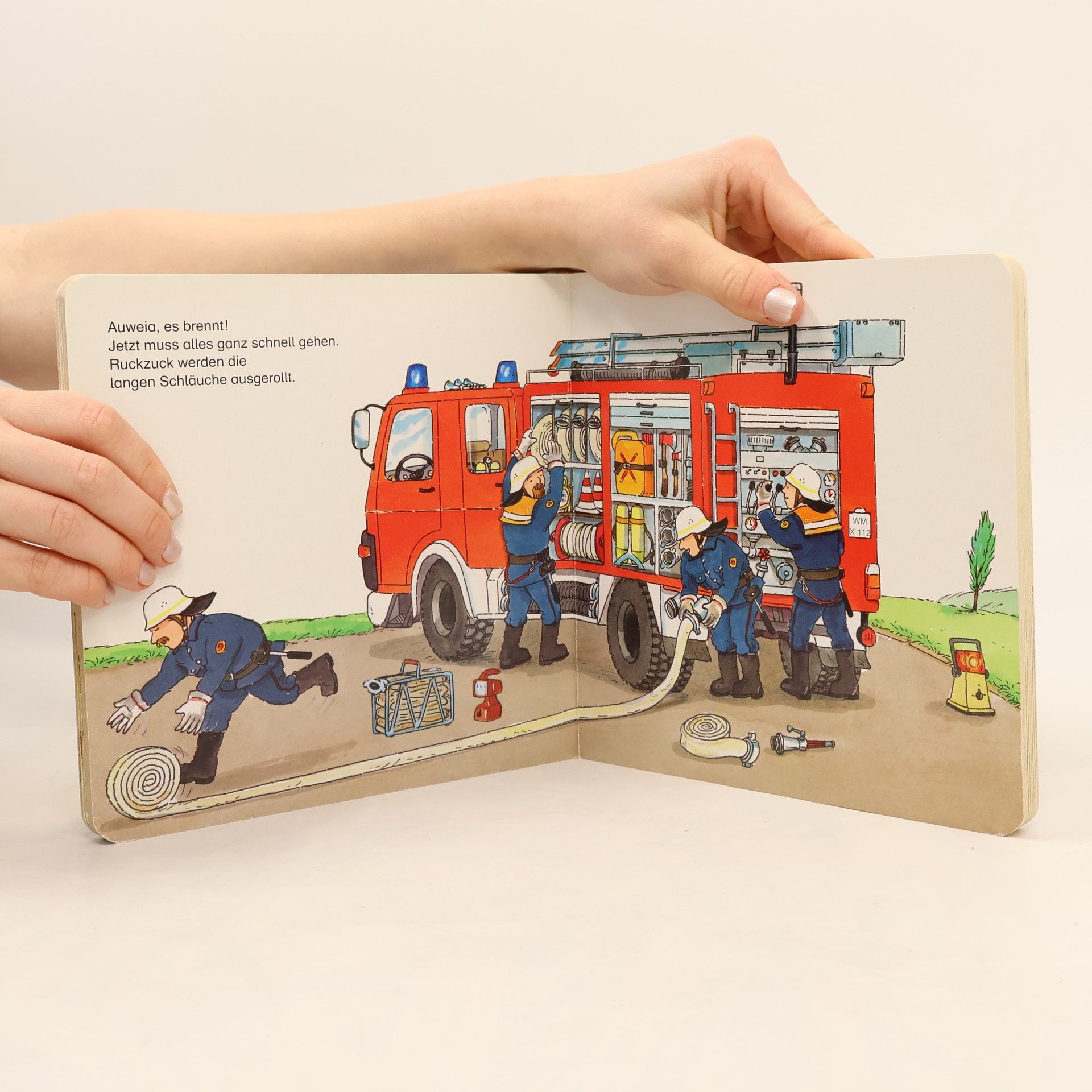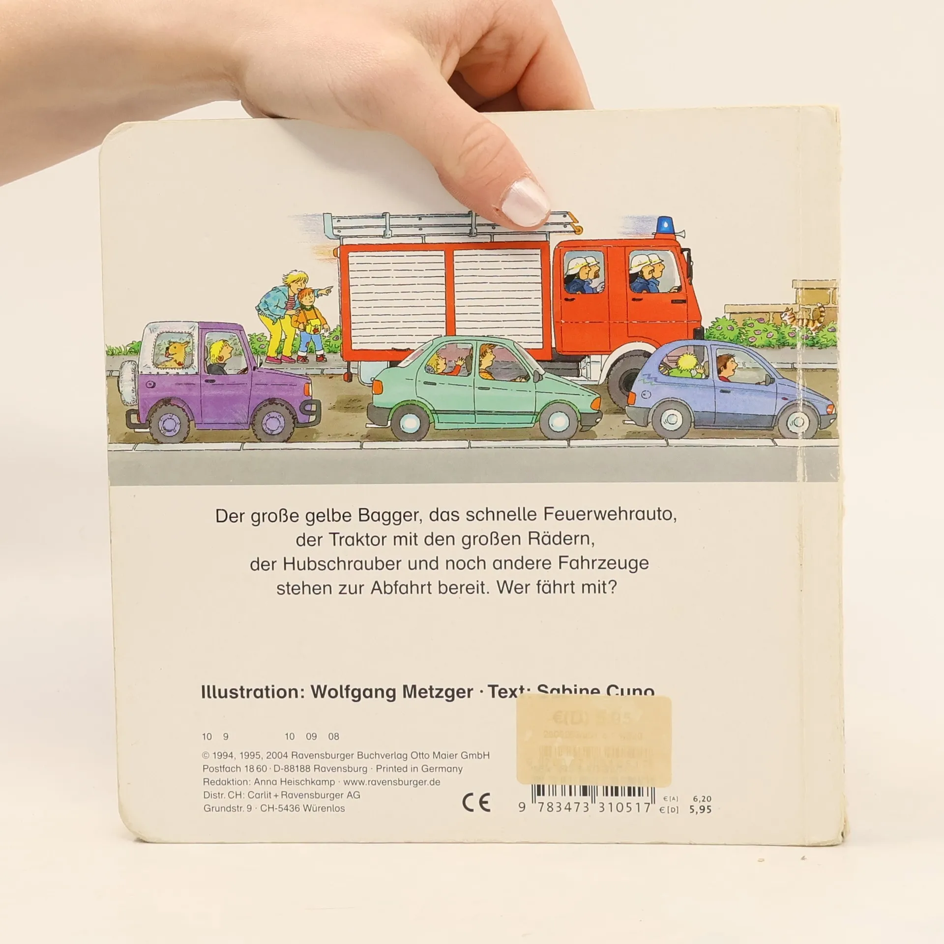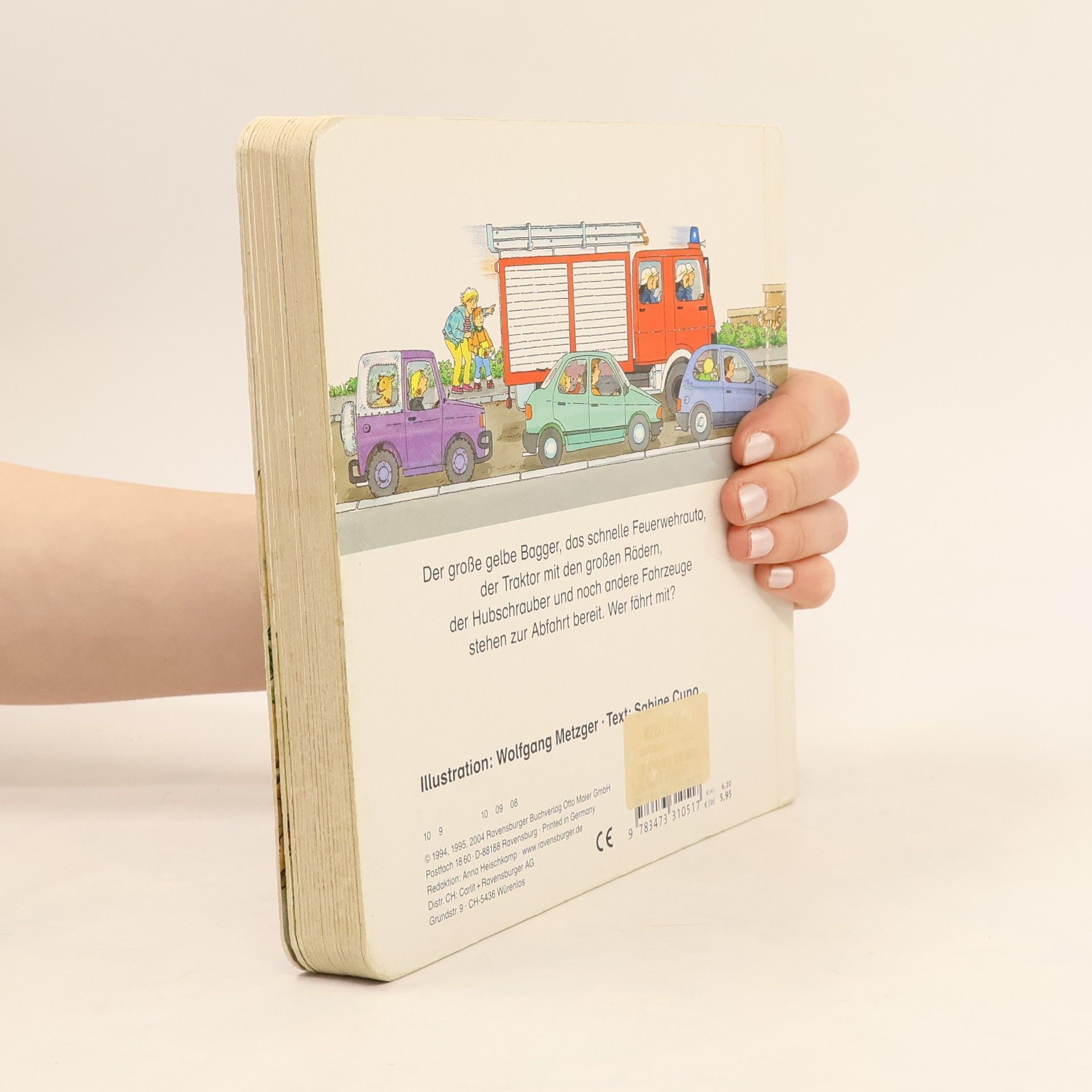 Der grosse gelbe Bagger ist unterwegs zur Baustelle. Dort gräbt er ein tiefes Loch und schüttet die Erde auf den Lastwagen. Ein anderer Lastwagen bringt Sand zur neuen Strasse. Das Bilderbuch zeigt grosse Fahrzeuge im Einsatz.
