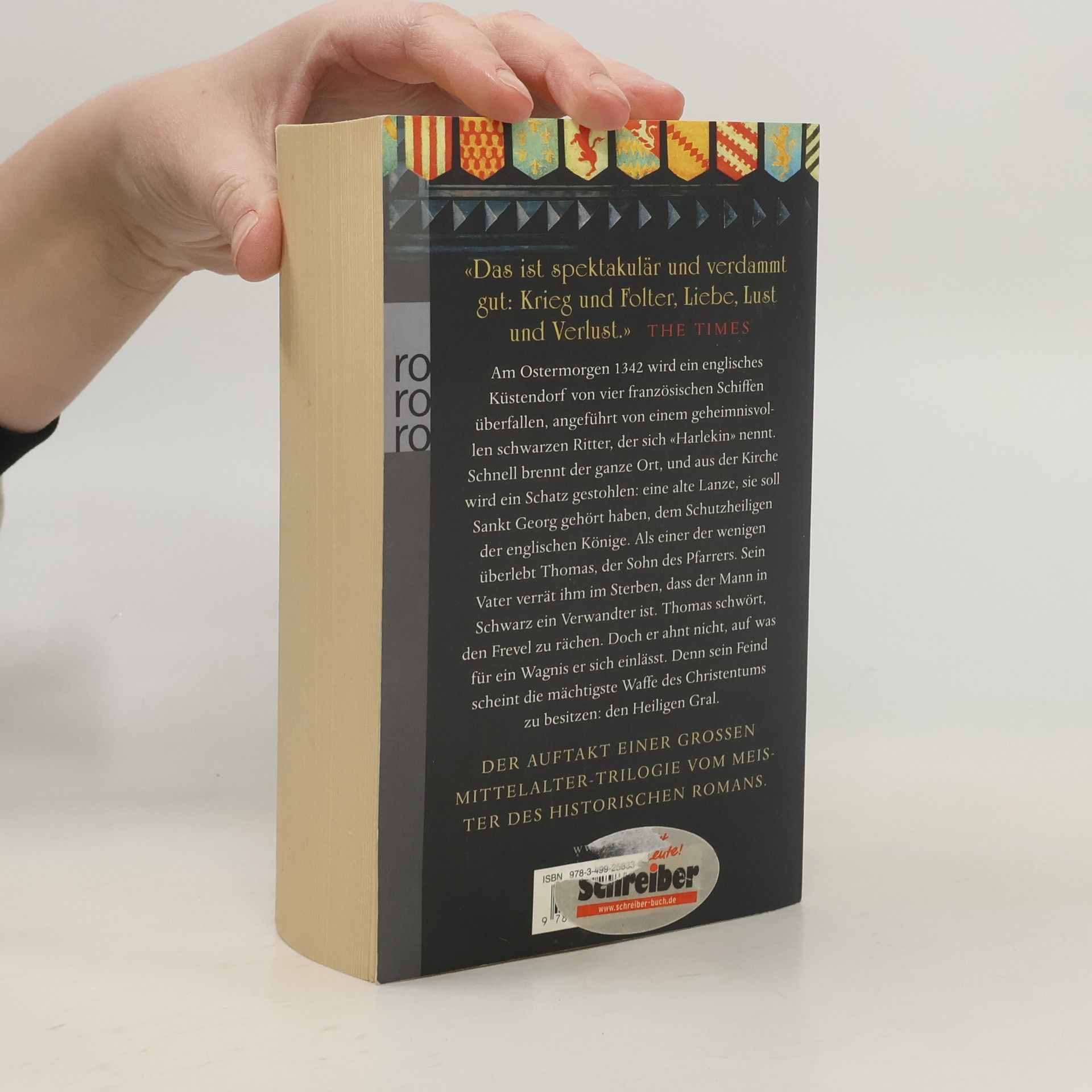 Am Ostermorgen 1342 wird ein englisches Küstendorf von vier französischen Schiffen überfallen, angeführt von einem geheimnisvollen schwarzen Ritter, der sich «Harlekin» nennt. Schnell brennt der ganze Ort, und aus der Kirche wird ein Schatz gestohlen: eine alte Lanze, sie soll Sankt Georg gehört haben, dem Schutzheiligen der englischen Könige. Als einer der wenigen überlebt Thomas, der Sohn des Pfarrers. Sein Vater verrät ihm im Sterben, dass der Mann in Schwarz ein Verwandter ist. Thomas schwört, den Frevel zu rächen. Doch er ahnt nicht, auf was für ein Wagnis er sich einlässt. Denn sein Feind scheint die mächtigste Waffe des Christentums zu besitzen: den Heiligen Gral. DER AUFTAKT EINER GROSSEN MITTELALTER-TRILOGIE VOM MEISTER DES HISTORISCHEN ROMANS Die Bücher vom Heiligen Gral, Band 1