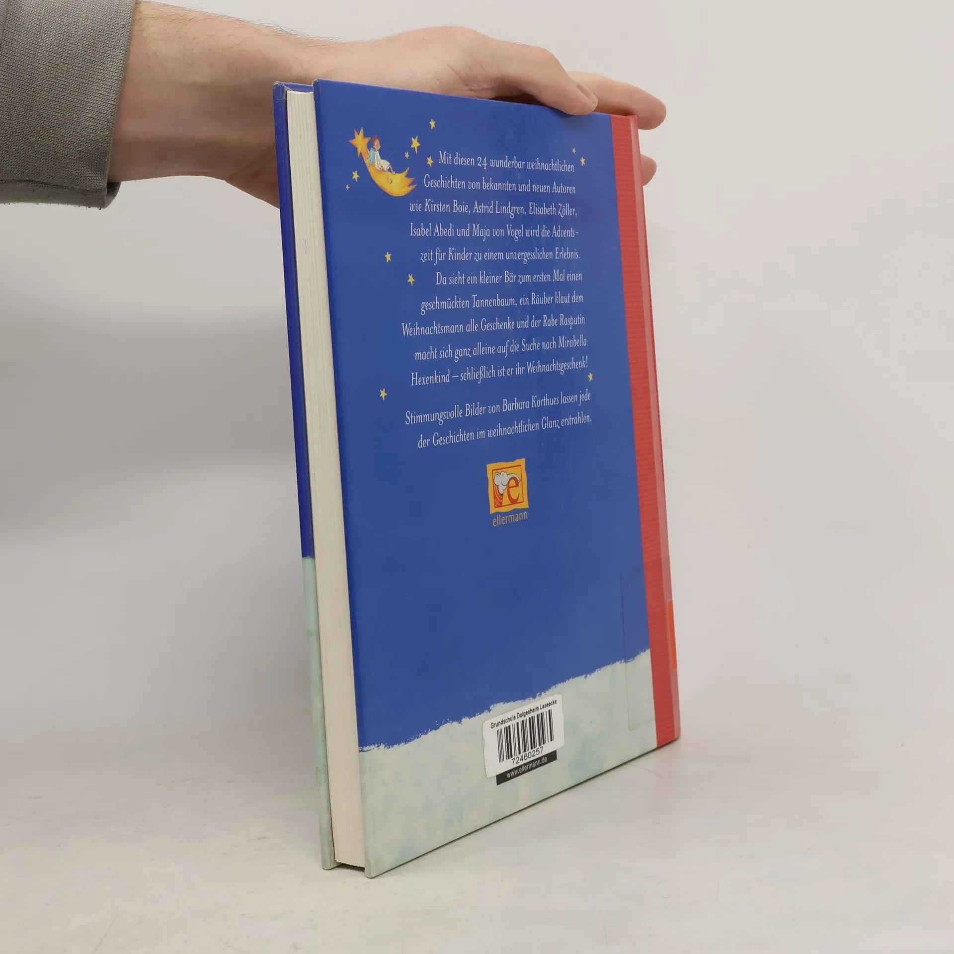 Vom Weihnachtsmann und der Weihnachtsmaus 24 wunderbar weihnachtliche Geschichten verkürzen den Kindern die Wartezeit aufs Fest. Mit dabei sind Klassiker wie „Die Weihnachtsmaus“ von James Krüss, Astrid Lindgrens „Bald ist Weihnachten“ und Kinderlieblinge wie „Schnüpperle“ oder „Jan und Julia“. Erhard Dietl erzählt von „Bärenstarken Weihnachten“, Elisabeth Zöller von „Konrad Meckerbär“ und Isabel Abedi von der wundersamen Reise des Raben Rasputin zu Mirabella Hexenkind. 24 Geschichten für die Weihnachtszeit für Kinder ab 4 Jahren, mit vielen farbigen Bildern von Barbara Korthues.
