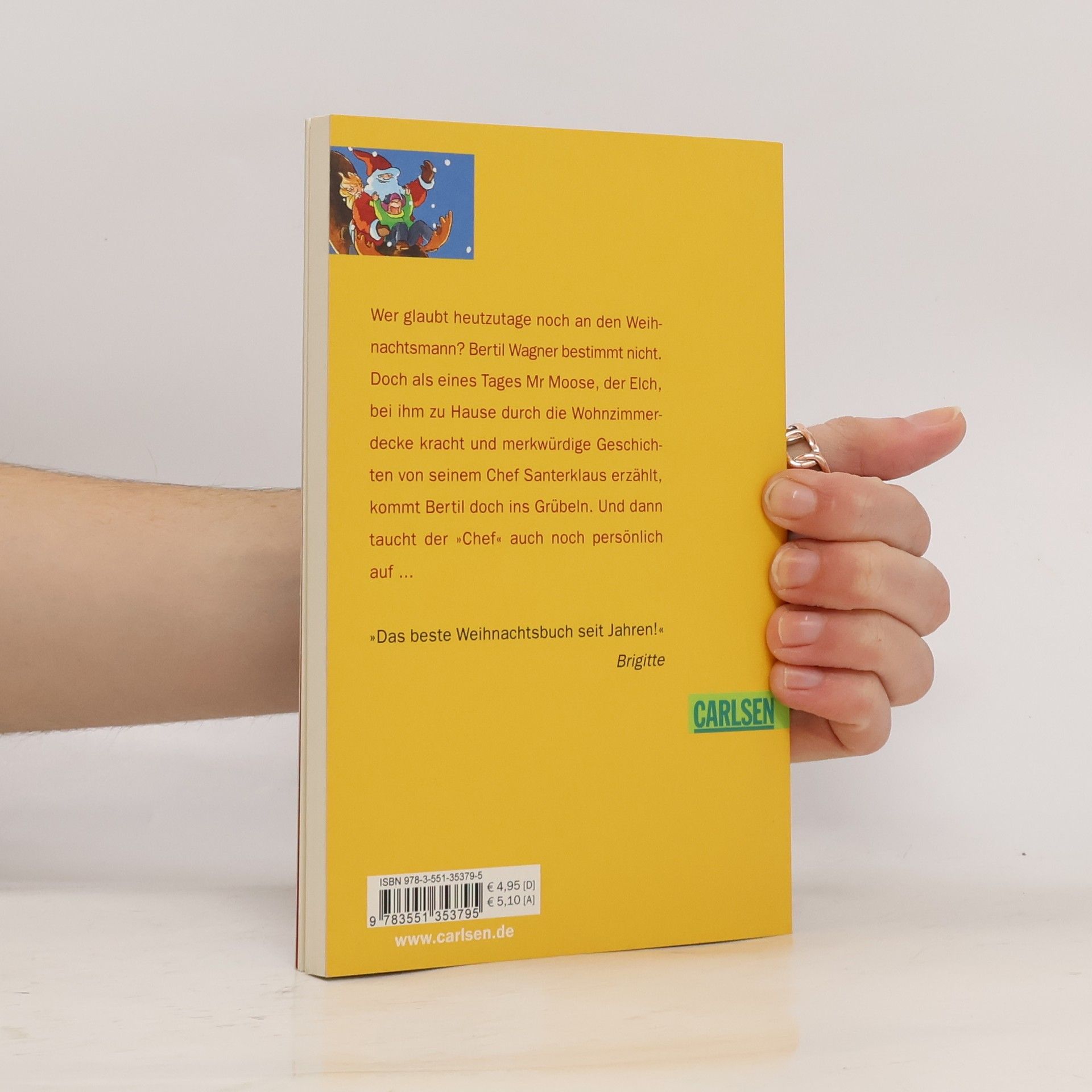 Wer glaubt schon an den Weihnachtsmann? Der kleine Bertil jedenfalls nicht mehr. Doch als eines Tages ein Elch durchs Dach mitten ins Wohnzimmer kracht und berichtet, dass er für den „Chef“ auf Probefahrt war, wird Bertil nachdenklich. In allen Einzelheiten lässt er sich von Mr Moose berichten, wie das mit dem Weihnachtsmann, dem Schlitten, den Rentieren und den Elchen (und den Geschenken!) so vor sich geht. Und als dann, ein paar Tage vor Weihnachten, der „Chef“ höchstpersönlich auftaucht, um Mr Moose wieder abzuholen, wird es wirklich spannend ..."