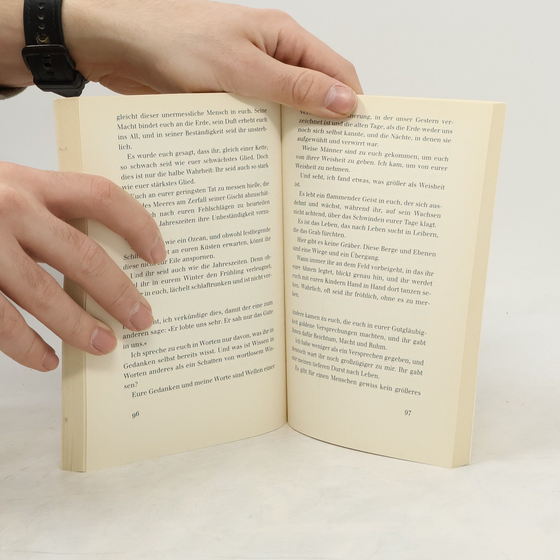 Die Wanderschaft des Propheten Almustafa ist ein spirituelles Gleichnis für den Weg durch das Menschenleben. Die Worte des Propheten rücken so manche unlautere Lebensgewohnheit zurecht und regen Zeile für Zeile zu Selbstbesinnung und Neuanfang an. In kompakter Form geben die zwei Propheten-Bücher die Essenz von Gibrans Vision wieder.
