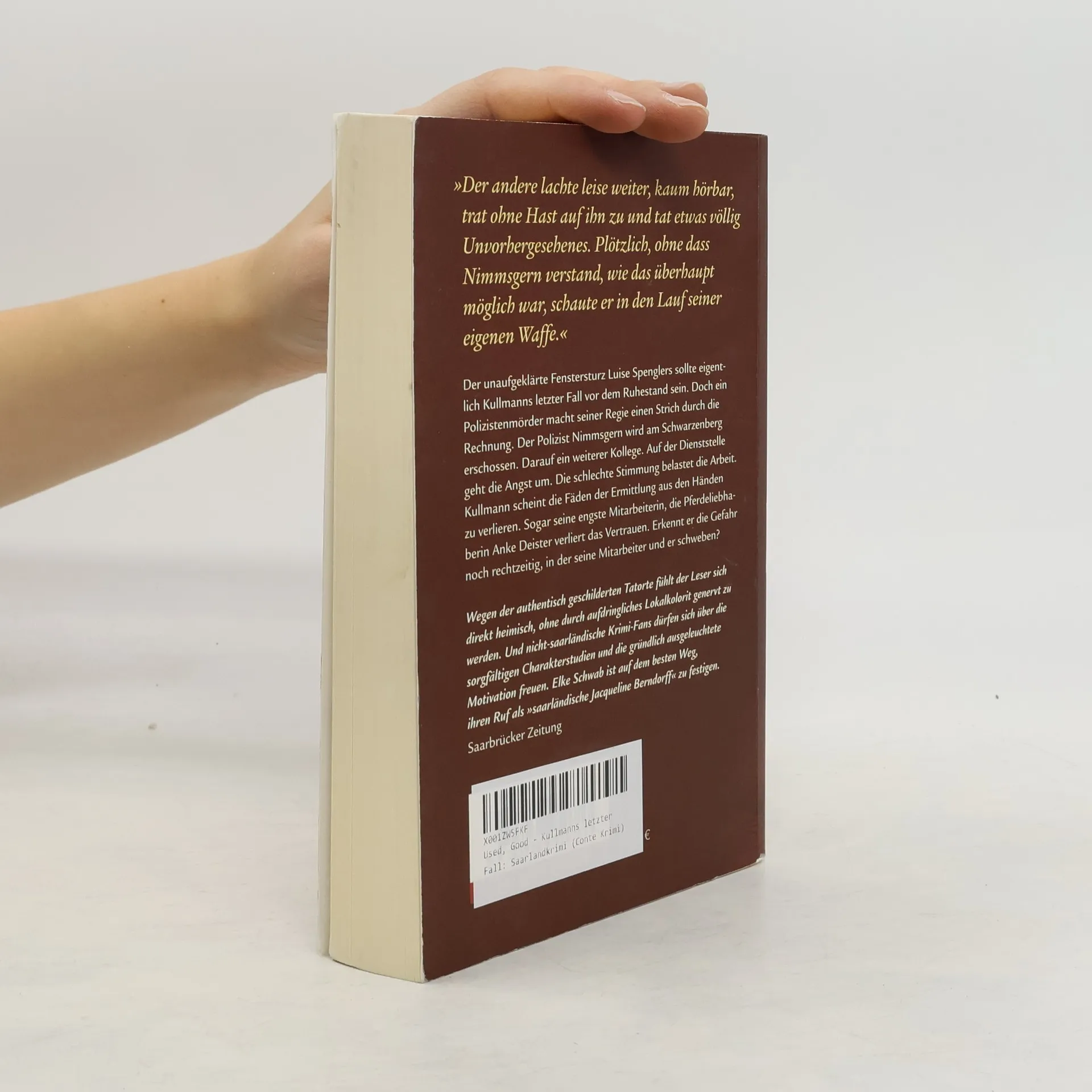 "Der andere lachte leise weiter, kaum hörbar, trat ohne Hast auf ihn zu und tat etwas völlig Unvorhergesehenes. Plötzlich, ohne dass Nimmsgern verstand, wie das überhaupt möglich war, schaute er in den Lauf seiner eigenen Waffe." Der unaufgeklärte Fenstersturz Luise Spenglers sollte eigentlich Kullmanns letzter Fall vor dem Ruhestand sein. Doch ein Polizistenmörder macht seiner Regie einen Strich durch die Rechnung. Der Polizist Nimmsgern wird am Schwarzenberg erschossen. Darauf ein weiterer Kollege. Auf der Dienststelle geht die Angst um. Die schlechte Stimmung belastet die Arbeit. Kullmann scheint die Fäden der Ermittlungen aus den Händen zu verlieren. Sogar seine engste Mitarbeiterin, die Pferdeliebhaberin Anke Deister verliert das Vertrauen. Erkennt er die Gefahr noch rechtzeitig, in der seine Mitarbeiter und er schweben? Elke Schwab, 1964 in Saarbrücken geboren, arbeitete beim Sozialministerium im Bereich Altenpolitik. Heute lebt die Pferdeliebhaberin jenseits der Grenze in einem elsässischen Bauernhaus. Sie ist Mitglied der Autorenvereinigungen "Mörderische Schwestern" und "Syndikat"