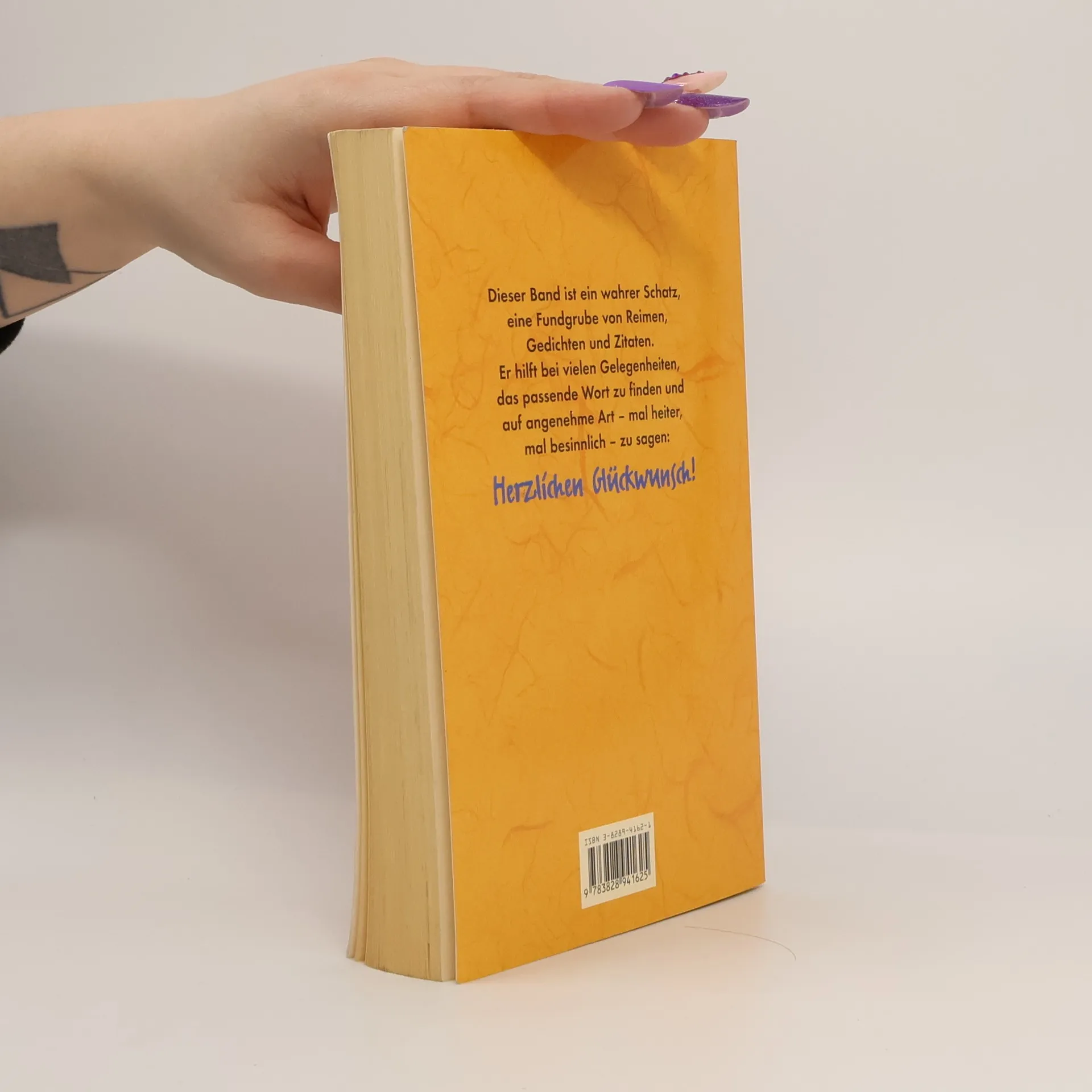 Dieser Band ist ein wahrer Schatz, eine Fundgrube von Reimen, Gedichten und Zitaten. Er hilft bei den unterschiedlichsten Anlässen - ob Geburtstag, Firmenjubiläum, Ruhestand oder Hochzeitsfeier - die passenden Wort zu finden und auf angenehme Art mal heiter, mal besinnlich, zu sagen: Herzlichen Glückwunsch!