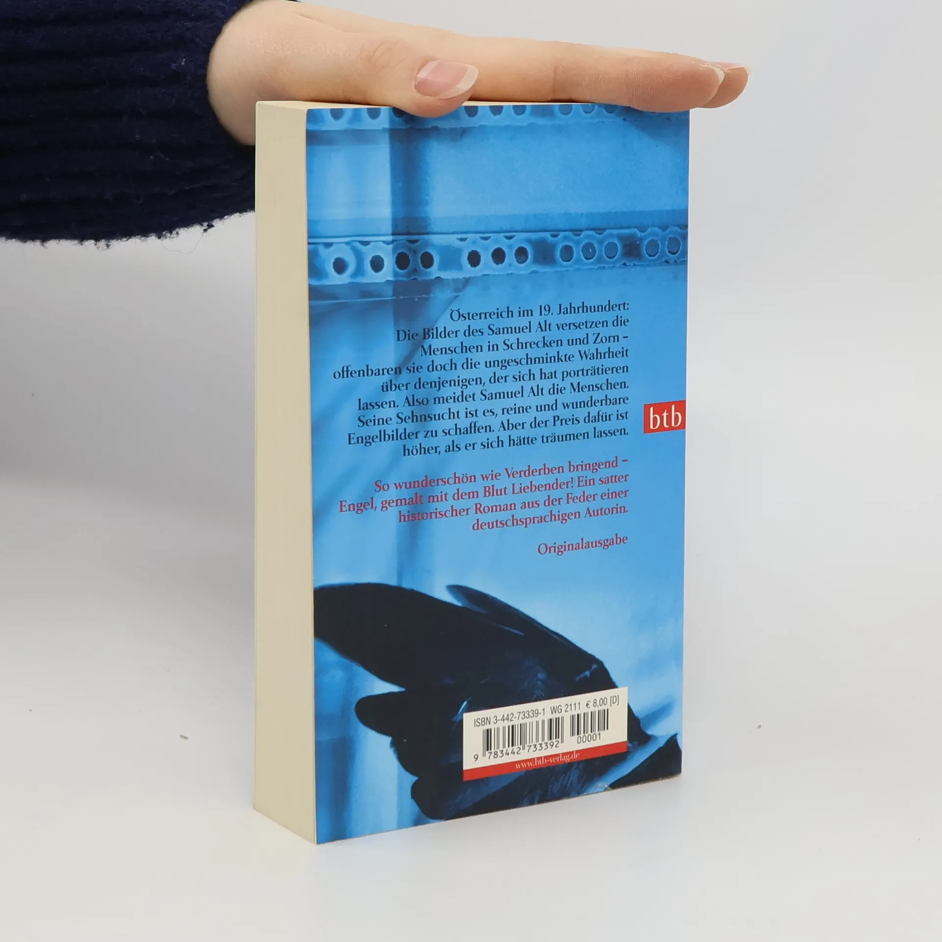 So wunderschön wie Verderben bringend – Engel, gemalt mit dem Blut Liebender. Österreich im 19. Jahrhundert: Schon seine Kinderzeichnungen versetzten die Menschen in Schrecken und Zorn. Konnte er doch die absolute, ungeschminkte Wahrheit über denjenigen zeigen, den er porträtierte. Als Bastard geboren – ohne Liebe und Zuwendung aufgezogen – wird aus dem feinsinnigen Samuel Alt schließlich ein verschrobener Kauz, der sich fleischlicher Lust und Liebe verweigert, um sich ganz der Malerei zu widmen. Aber seine Bilder sind nicht perfekt. Bis er herausfindet, dass er mit dem Blut Liebender wunderbare Engel malen kann …