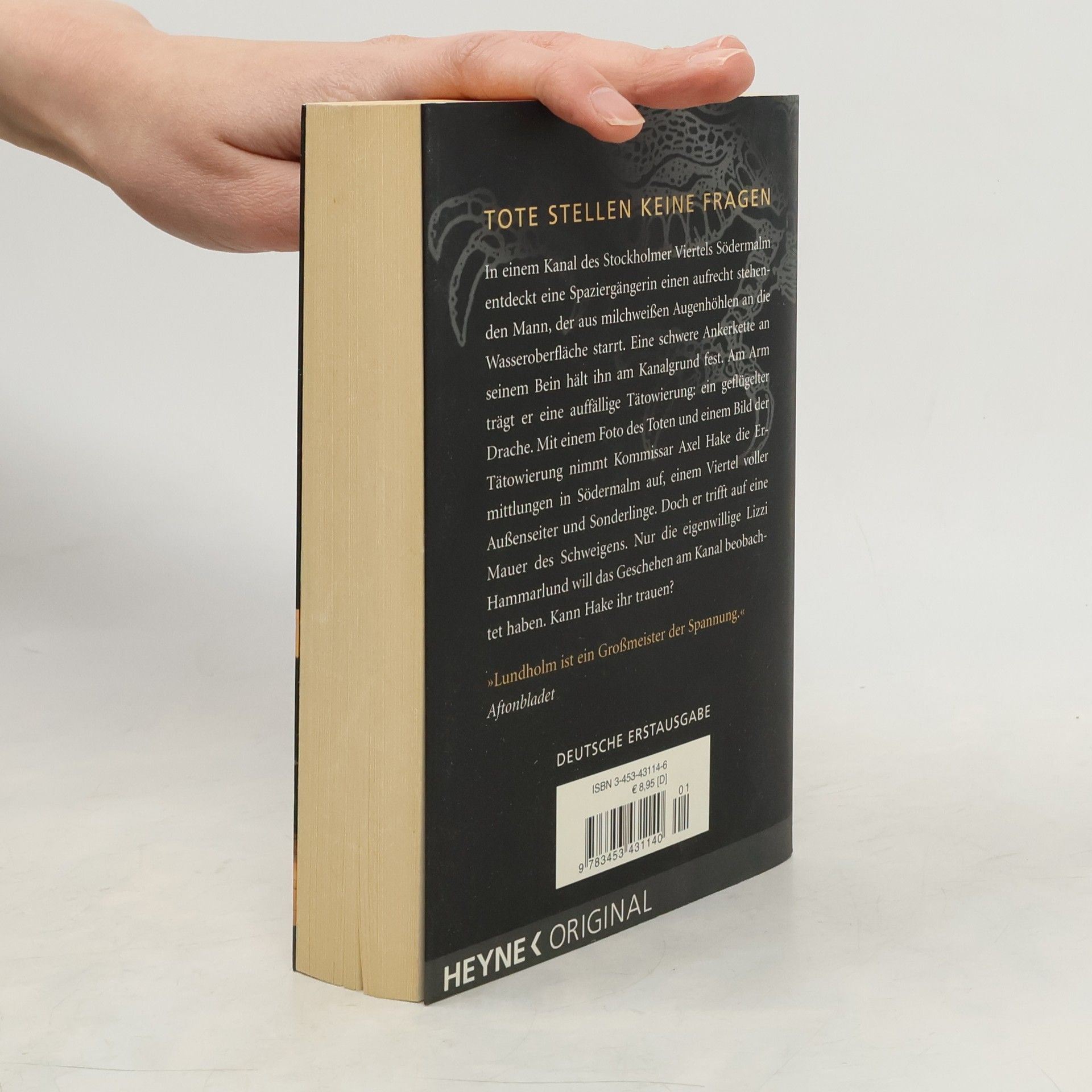 In einem Kanal des Stockholmer Viertels Södermalm wir ein aufrecht im Wasser stehender bleicher Mann entdeckt, der aus milchweissen Augenhöhlen an die Oberfläche starrt. Eine schwere Ankerkette an seinem Bein hält ihn unter Wasser. Am Arm trägt er eine auffällige Tätowierung: ein geflügelter Drache. Mit einem Foto des Toten und einem Bild der Tätowierung nimmt Kommissar Axel Hake die Ermittlungen in Södermalm auf, einem Viertel voller schräger Figuren und gescheiterter Existenzen. Bald wird ein Gebrauchtwagenhändler als vermisst gemeldet und seine Frau gibt vor, der Tote sei ihr Mann. Doch all das passt nicht zu den Beobachtungen der skurrilen Lizzi Hammarlund, die das Geschehen am Kanal den ganzen Tag über aus dem Fenster beobachtet. Kann Hake ihr vertrauen?§Der Auftakt zu einer großen Stockholm-Krimiserie.
