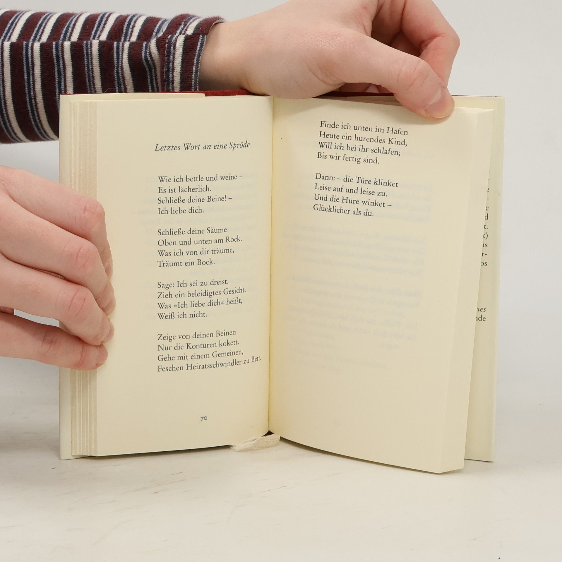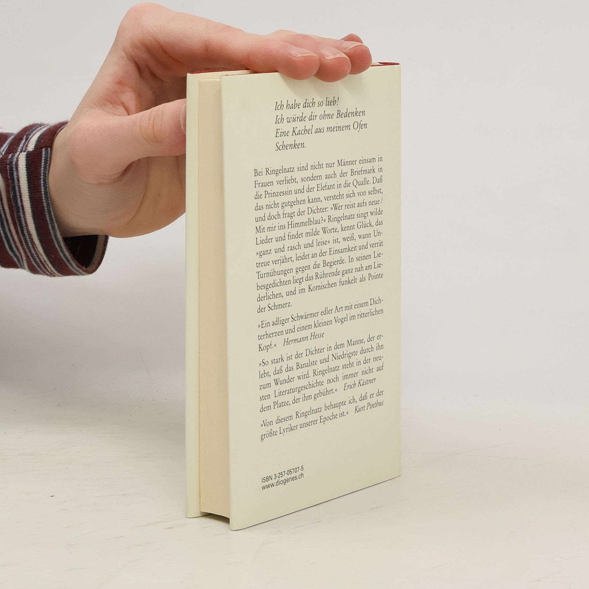 Bei Ringelnatz sind nicht nur Männer einsam in Frauen verliebt, sondern auch der Briefmark in die Prinzessin und der Elefant in die Qualle. Daß das nicht gutgehen kann, versteht sich von selbst, und doch fragt der Dichter: „Wer reist aufs neue / Mit mir ins Himmelblau?“ Ringelnatz singt wilde Lieder und findet milde Worte, kennt Glück, das „ganz und rasch und leise“ ist, weiß, wann Untreue verjährt, leidet an der Einsamkeit und verrät Turnübungen gegen die Begierde. In seinen Liebesgedichten liegt das Rührende ganz nah am Liederlichen, und im Komischen funkelt als Pointe der Schmerz.