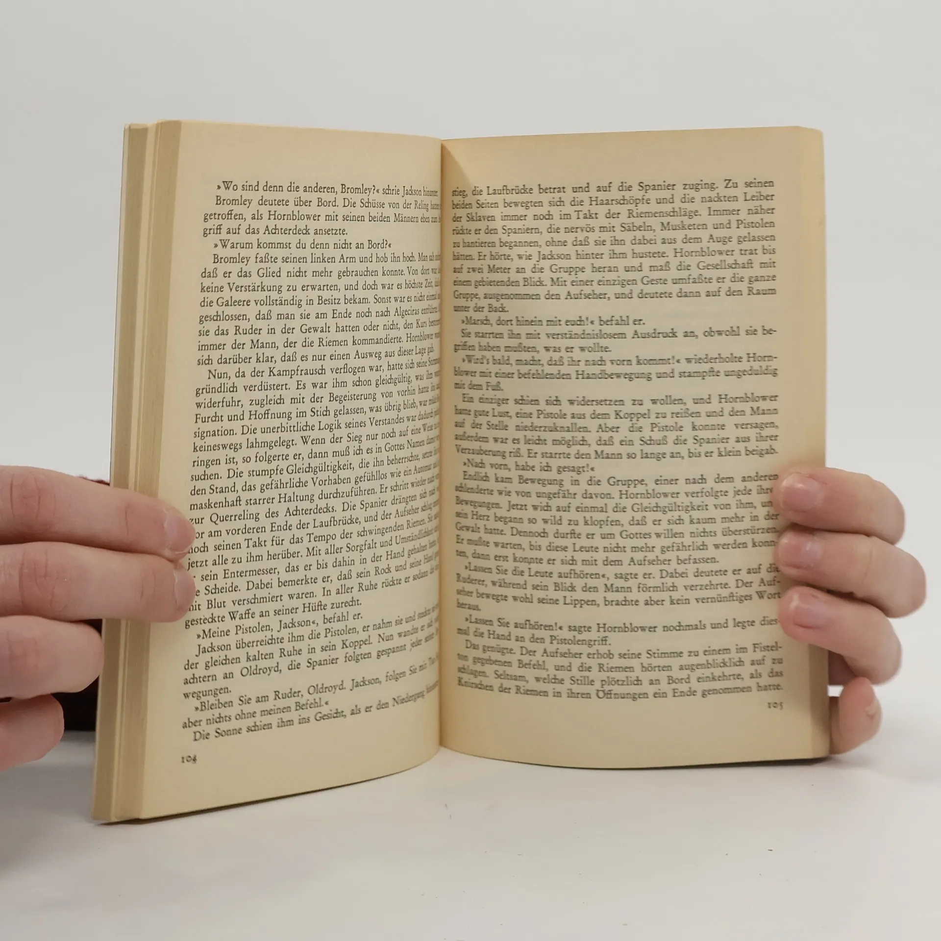 Wir schreiben das Jahr 1794. Bleich um die Nase herum und sichtlich seekrank meldet sich ein jünger Fähnrich namens Horatio Hornblower an Bord des englischen Kriegsschiffs Justinian zum Dienst. Nicht, aber auch gar nichts gibt zunächst Anlaß, in dem siebzehnjährigen Schlaks einen künftigen Seehelfen zu vermuten. Aber Hornblower erweist sich als ebenso strebsam wie aufgeweckt, Besteckaufgabe bei der Navigation bilden kein Problem für ihn, und wenn es sein muß, schreckt er auch vor einem Duell auf Leben und Tod nicht zurück. Relativ rasch erfolgt seine Versetzung auf die Fregatte Indefatigable, und er erhält mehrfach die Gelegenheit, sich zu bewähren. Etwa als es gilt, mit nur vier Mann, die seinem Befehl unterstellt werden, eine gekaperte, schwer beschädigte französische Brigg als Prise in einen englischen Hafen zu bringen. Oder tollkühn an der Spitze eines Enterkommandos, das in der Nähe der Girondemündung eine gegnerische Korvette erstürmt. Mittlerweile ist auch Spanien auf Napoleons Seite in den Krieg eingetreten. Vor Cadiz vermag sich Hornblower bei der Erbeutung einer Galeere erneut auszuzeichnen, doch dann bestimmt das Schicksal ihm das entsetzliche Los, in spanische Kriegsgefangenschaft zu geraten.