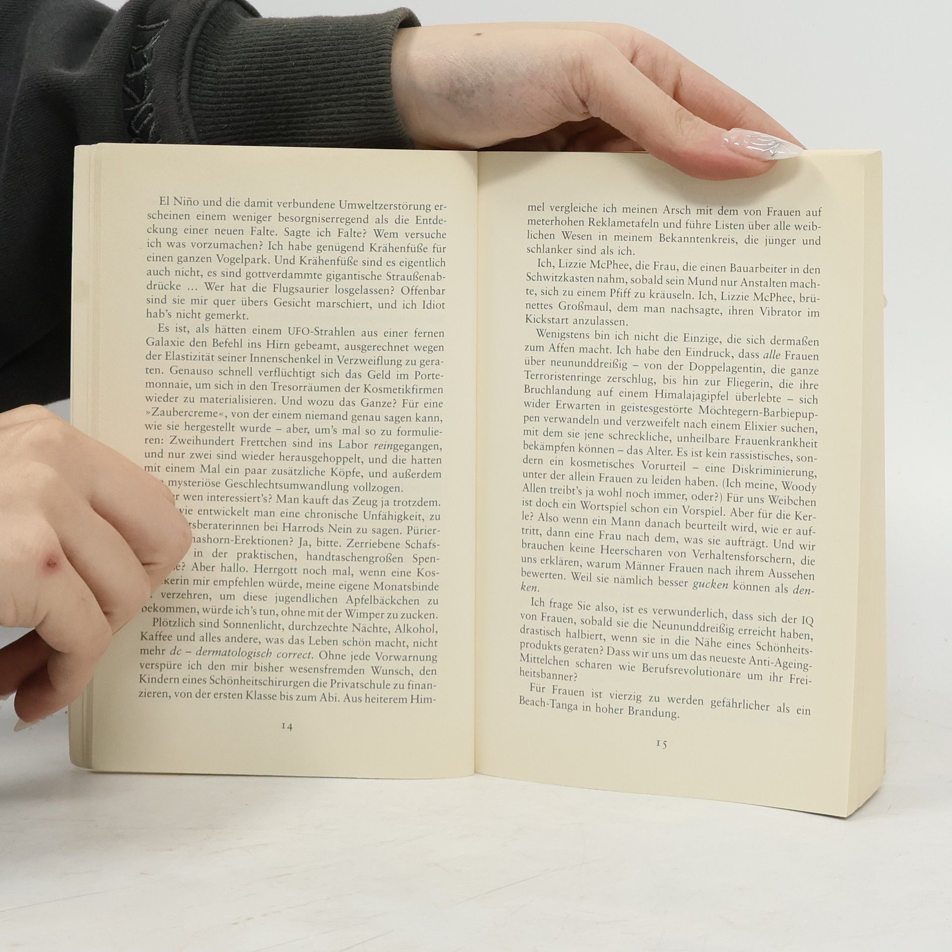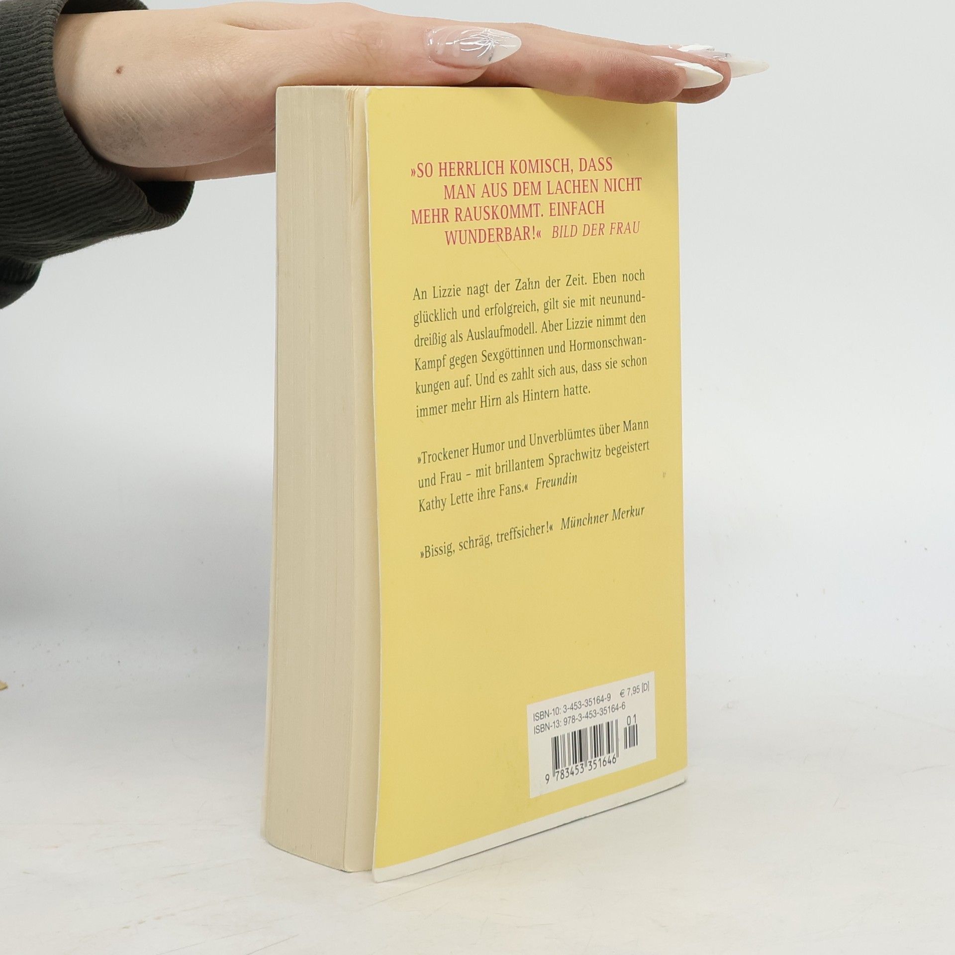 An Lizzie nagt der Zahn der Zeit. Eben noch glücklich und erfolgreich, gilt sie mit neununddreißig als Auslaufmodell. Aber Lizzie nimmt den Kampf gegen Sexgöttinnen und Hormonschwankungen auf. Und es zahlt sich aus, dass sie schon immer mehr Hirn als Hintern hatte. Lizzie hat noch nie Zweifel daran gehabt, was im Leben wirklich wichtig ist und dass Bewusstsein über Busen geht. Sie konnte sich stets der Liebe ihres Mannes Hugo sicher sein, der großzügig über ihre stacheligen Beine und ihre Krähenfüße hinwegsah. Auch an das Älterwerden verschwendete sie keinen Gedanken, bis ihr auf einen Schlag klargemacht wird, was es heißt, auf die 40 zuzugehen: Ihre Stelle als Nachrichtensprecherin muss sie für ein hohles hübsches Ding räumen, und Hugo rutscht Herz und Verstand in die Hose, weil er sich in eine Schauspielerin verliebt, die seine Tochter sein könnte und die nur aus Kurven und Knochen zu bestehen scheint. Lizzie beschließt, sich nicht kampflos der Midlifecrisis zu ergeben. Aber was kann man mit Prinzipien gegen Sexgöttinnen und Hormone ausrichten? Soll Lizzie sich selbst unters Messer legen, bevor das Leben es ihr in den Rücken stößt?