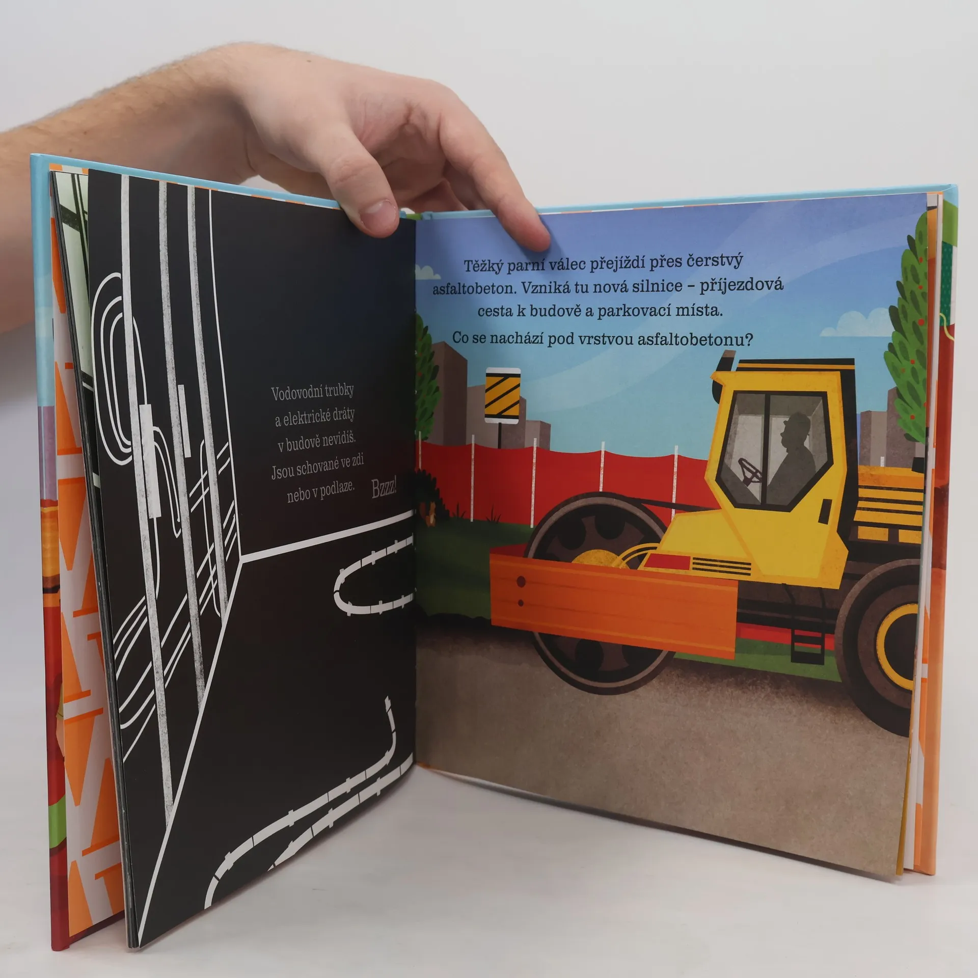 Přidrž si stránky knihy proti světlu nebo je prosviť zespodu baterkou… Uvidíš nákresy domu, vnitřky strojů a nové budovy. Sleduj, co vše se skrývá na stavbě.