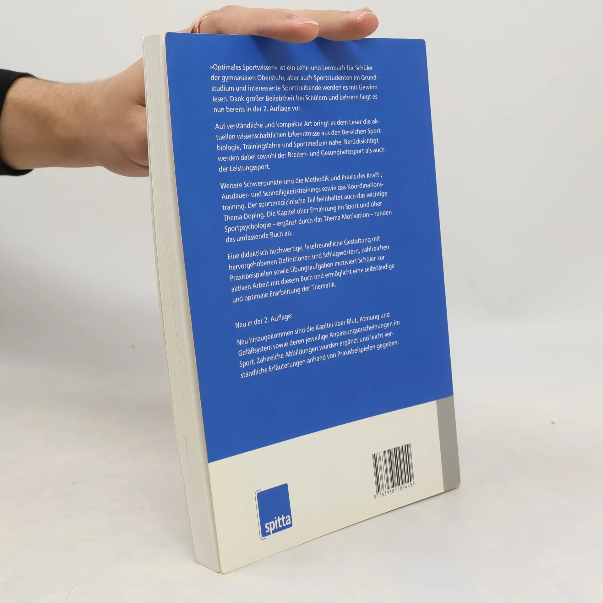 „Optimales Sportwissen“ ist ein Lehr- und Lernbuch für Schüler der gymnasialen Oberstufe, aber auch Sportstudenten im Grundstudium und interessierte Sporttreibende werden es mit Gewinn lesen. Dank großer Beliebtheit bei Schülern und Lehrern liegt es nun bereits in der 2. Auflage vor. Auf verständliche und kompakte Art bringt es dem Leser die aktuellen wissenschaftlichen Erkenntnisse aus den Bereichen Sportbiologie, Trainingslehre und Sportmedizin nahe. Berücksichtigt werden dabei sowohl der Breiten- und Gesundheitssport als auch der Leistungssport. Weitere Schwerpunkte sind die Methodik und Praxis des Kraft-, Ausdauer- und Schnelligkeitstrainings sowie das Koordinationstraining. Der sportmedizinische Teil beinhaltet auch das wichtige Thema Doping. Die Kapitel über Ernährung im Sport und über Sportpsychologie – ergänzt durch das Thema Motivation – runden das umfassende Buch ab. Eine didaktisch hochwertige, lesefreundliche Gestaltung mit hervorgehobenen Definitionen und Schlagwörtern, zahlreichen Praxisbeispielen sowie Übungsaufgaben motiviert Schüler zur aktiven Arbeit mit diesem Buch und ermöglicht eine selbständige und optimale Erarbeitung der Thematik. Neu in der 2. Auflage: Neu hinzugekommen sind die Kapitel über Blut, Atmung und Gefäßsystem sowie deren jeweilige Anpassungserscheinungen im Sport. Zahlreiche Abbildungen wurden ergänzt und leicht verständliche Erläuterungen anhand von Praxisbeispielen gegeben.