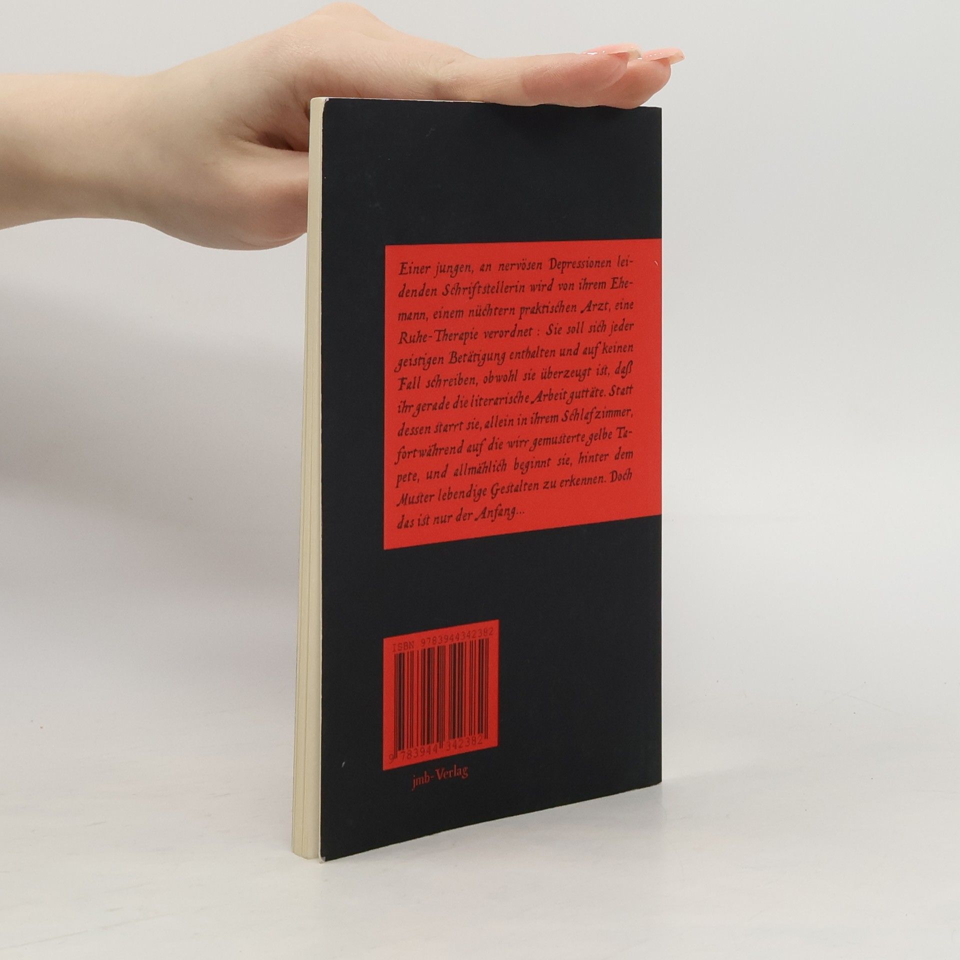 Einer jungen, an nervösen Depressionen leidenden Schriftstellerin wird von ihrem Ehemann, einem nüchtern praktischen Arzt, eine Ruhe-Therapie verordnet: Sie soll sich jeder geistigen Betätigung enthalten und auf keinen Fall schreiben, obwohl sie überzeugt ist, daß ihr gerade die literarische Arbeit guttäte. Statt dessen starrt sie, allein in ihrem Schlafzimmer, fortwährend auf die wirr gemusterte gelbe Tapete, und allmählich beginnt sie, hinter dem Muster lebendige Gestalten zu erkennen. Doch das ist nur der Anfang...