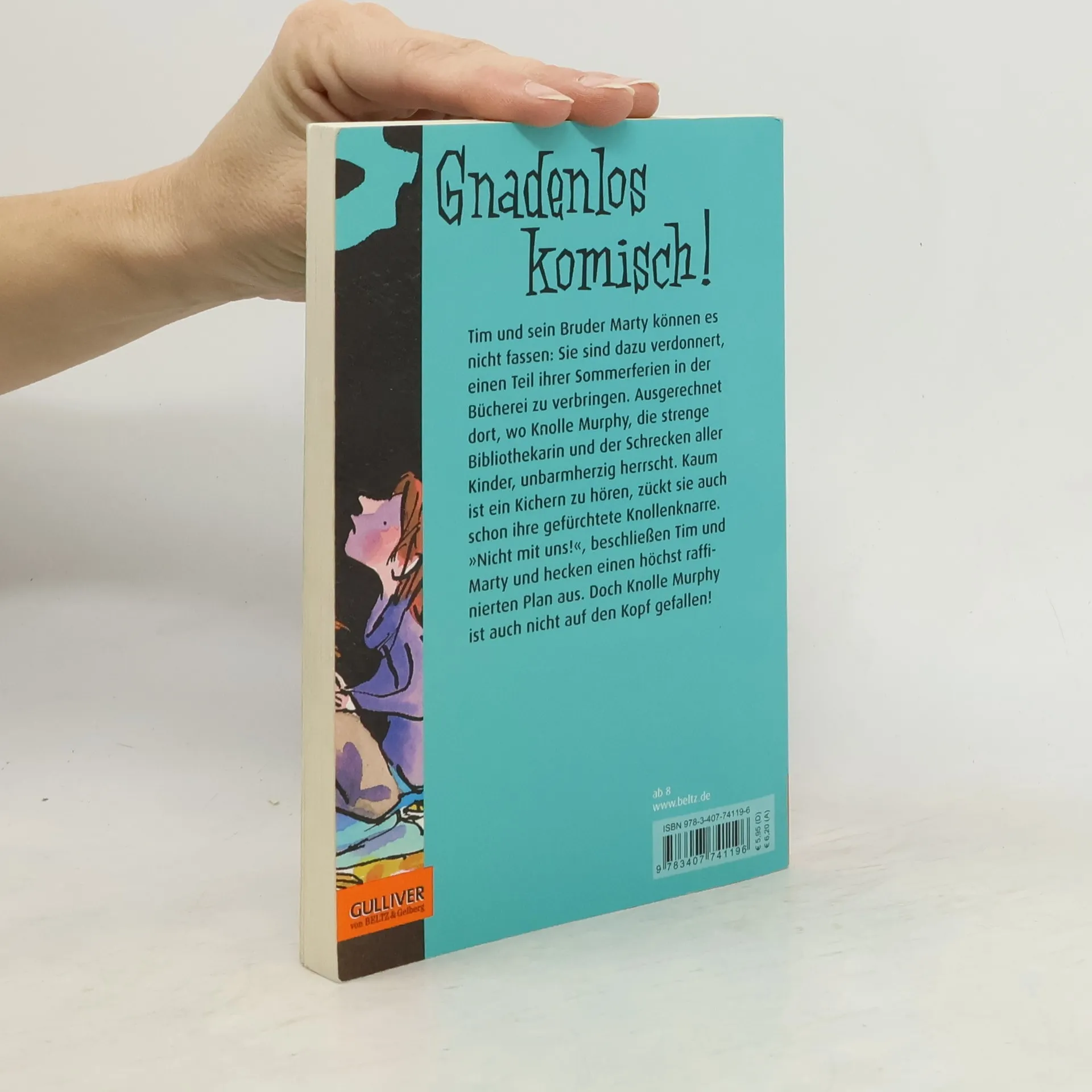»Gnadenlos komisch!« DB mobil Tim und sein Bruder Marty werden dazu verdonnert, einen Teil der Sommerferien in der Bücherei zu verbringen. Ausgerechnet dort, wo Knolle Murphy, strenge Bibliothekarin und Schrecken aller Kinder, unbarmherzig herrscht. Kaum ist ein Kichern zu hören, zückt sie schon ihre gefürchtete Knollenknarre. “Nicht mit uns!”, beschließen die beiden Rabauken und hecken einen raffinierten Plan aus. Aber Knolle Murphy ist nicht auf den Kopf gefallen. Eine meisterhaft erzählte, höchst komische Geschichte mit vielen Bildern.