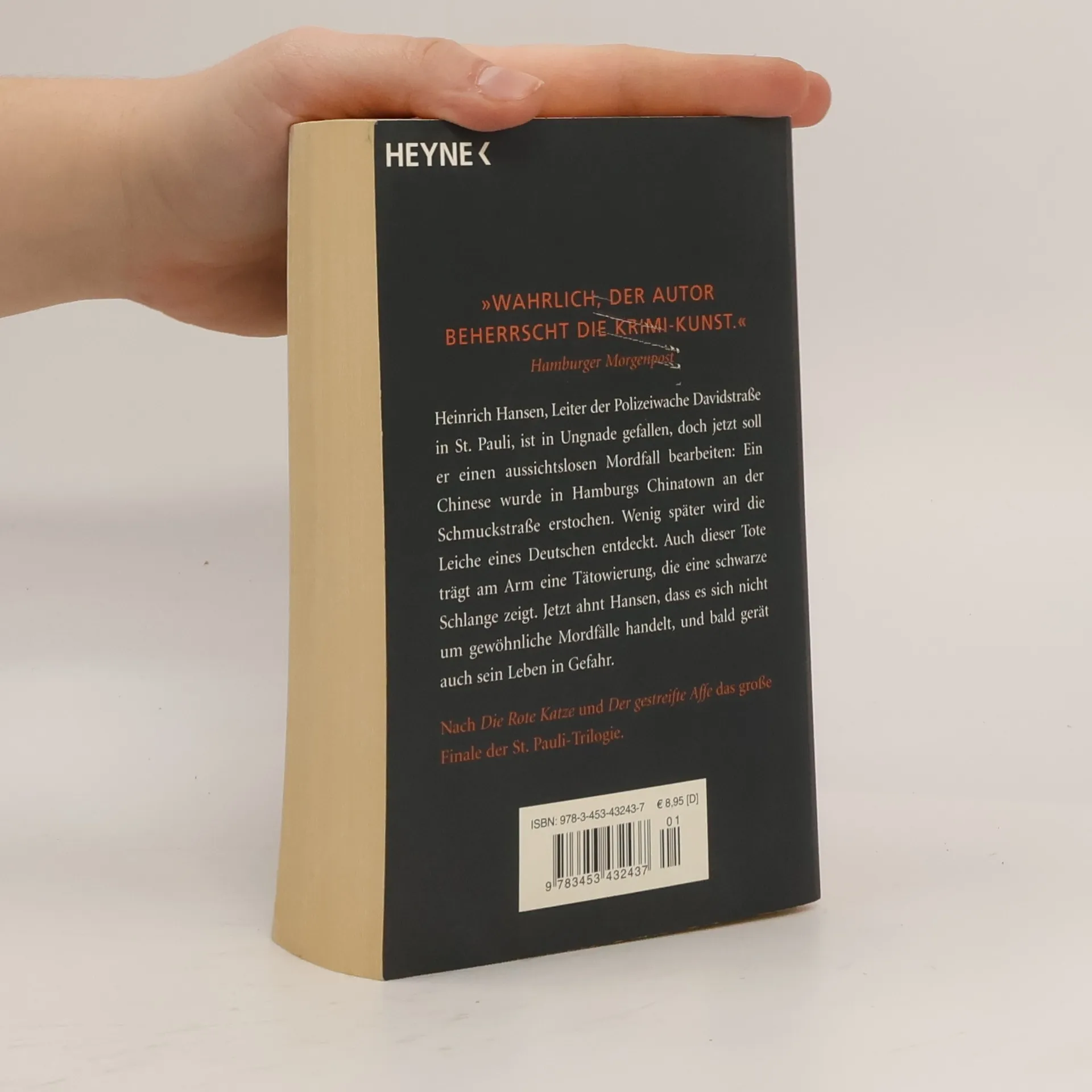 Hamburg-St. Pauli: das Ende einer Legende Heinrich Hansen, Leiter der Polizeiwache Davidstraße, ist in Ungnade gefallen, doch jetzt soll er einen aussichtslosen Mordfall bearbeiten: Ein Chinese wurde in Hamburgs Chinatown an der Schmuckstraße erstochen. Als wenig später die Leiche eines Deutschen dazukommt, gerät Hansen zwischen alle Fronten. Seit Kriegsbeginn herrschen Verdunkelungszwang und Tanzverbot. Prostitution ist nur noch eingeschränkt in der Herbertstraße erlaubt. Alle Rotlichtlokale und Varietés werden zu sittsamen Vorführungen im völkischen Sinne verpflichtet. Striptease wird zum KdF-Vergnügen. Aufmüpfige Jugendliche wie die Swing-Heinis geraten in immer größere Schwierigkeiten. Kriminelle werden rigoros verfolgt. Die Polizei steht unter Aufsicht der NSDAP. Für Heinrich Hansen, den Revierleiter der Davidwache, wird die Situation schwierig. Als er sich nicht den Willkürmethoden der Hamburger Polizei anpassen will, wird er degradiert. Als normaler Kripobeamter soll er nun einen obskuren Mord an einem chinesischen Hausierer aufklären, dessen Leiche nachts auf der Schmuckstraße abgeladen wurde. Auf der Schulter des Toten entdeckt Hansen eine eintätowierte schwarze Schlange. Die Spur führt in einen der in Hamburg berüchtigten Chinesenkeller.