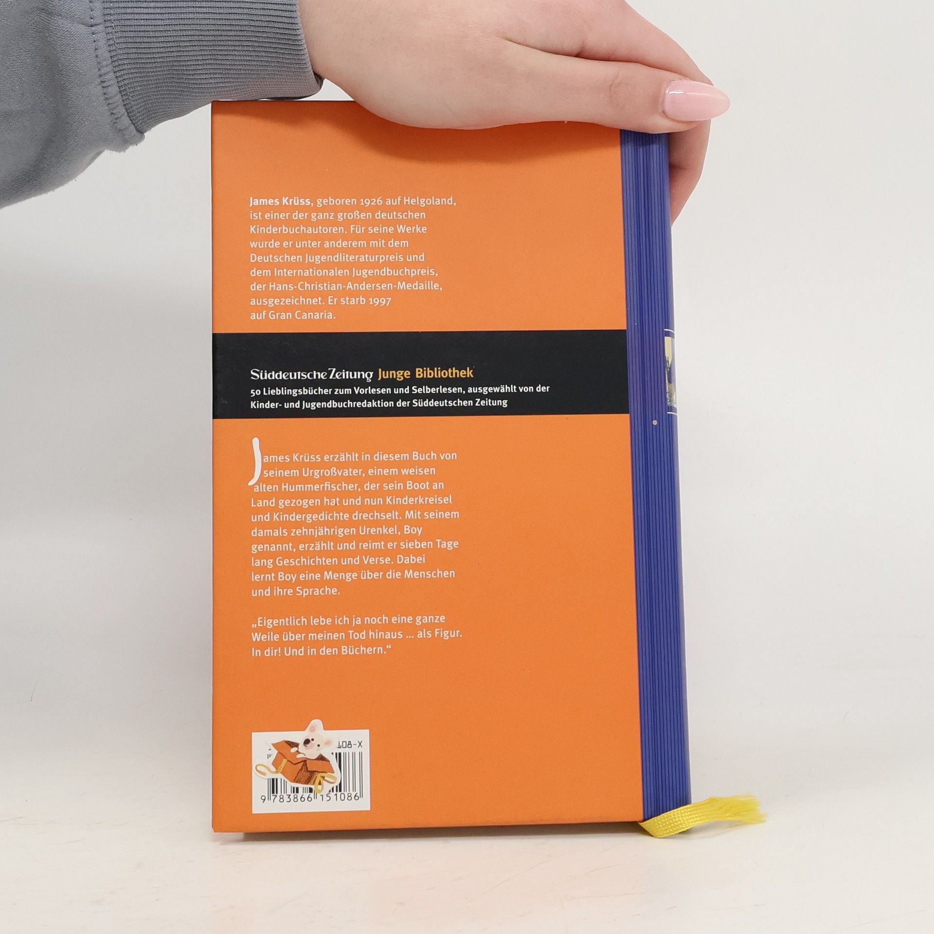 James Krüss erzählt in diesem Buch von seinem Urgroßvater, einem weisen alten Hummerfischer, der sein Boot an Land gezogen hat und nun Kinderkreisel und Kindergedichte drechselt. Mit seinem damals zehnjährigen Urenkel, Boy genannt, erzählt und reimt er sieben Tage lang Geschichten und Verse. Dabei lernt Boy eine Menge über die Menschen und ihre Sprache. "Eigentlich lebe ich ja noch eine ganze Weile über meinen Tod hinaus ... als Figur. In dir! Und in den Büchern."