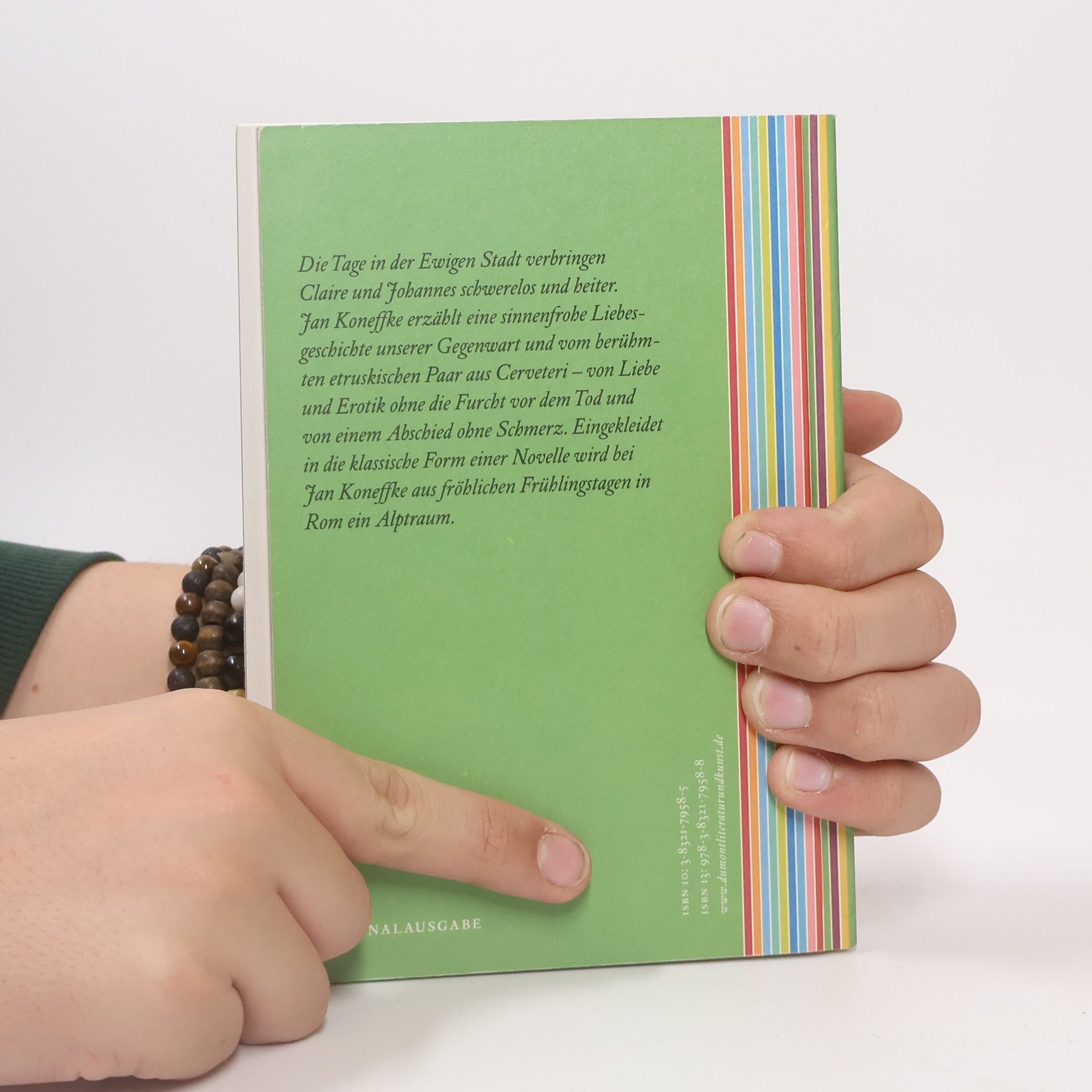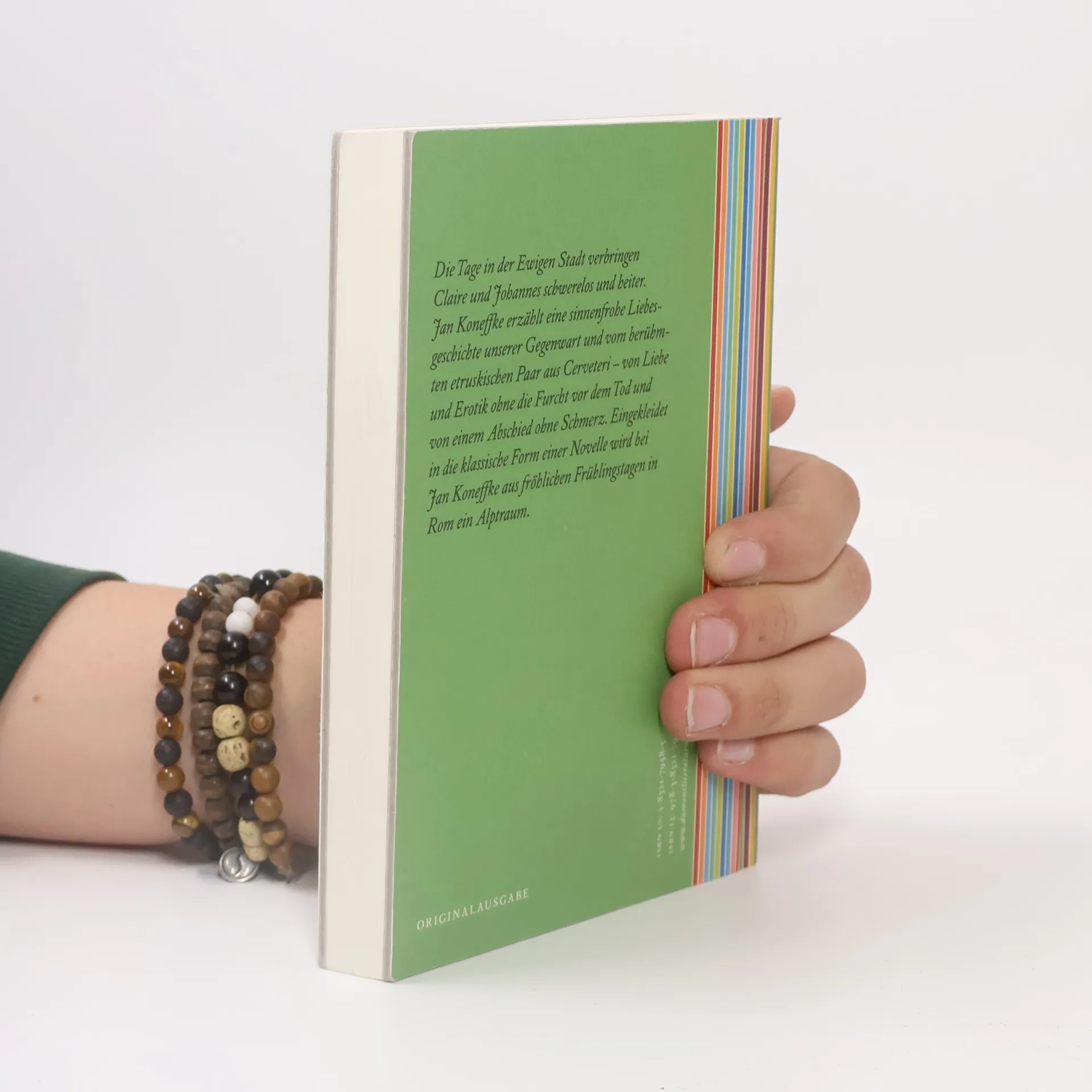 Die Tage in der Ewigen Stadt verbringen Claire und Johannes schwerelos und heiter. Jan Koneffke erzählt eine sinnenfrohe Liebesgeschichte unserer Gegenwart und vom berühmten etruskischen Paar aus Cerveteri – von Liebe und Erotik ohne die Furcht vor dem Tod und von einem Abschied ohne Schmerz. Eingekleidet in die klassische Form einer Novelle wird bei Jan Koneffke aus fröhlichen Frühlingstagen in Rom ein Alptraum.
