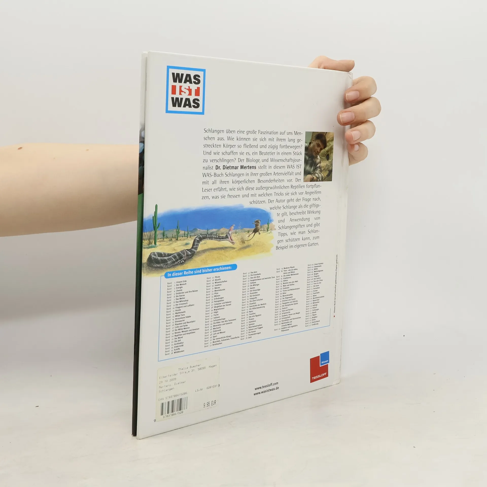 Der Biologe und Wissenschaftsjournalist Dr. Dietmar Mertens stellt Schlangen in ihrer großen Artenvielfalt und mit all ihren körperlichen Besonderheiten vor. Der Leser erfährt, wie sich diese außergewöhnlichen Reptilien fortpflanzen, was sie fressen und mit welchen Tricks sie sich vor Angreifern schützen.