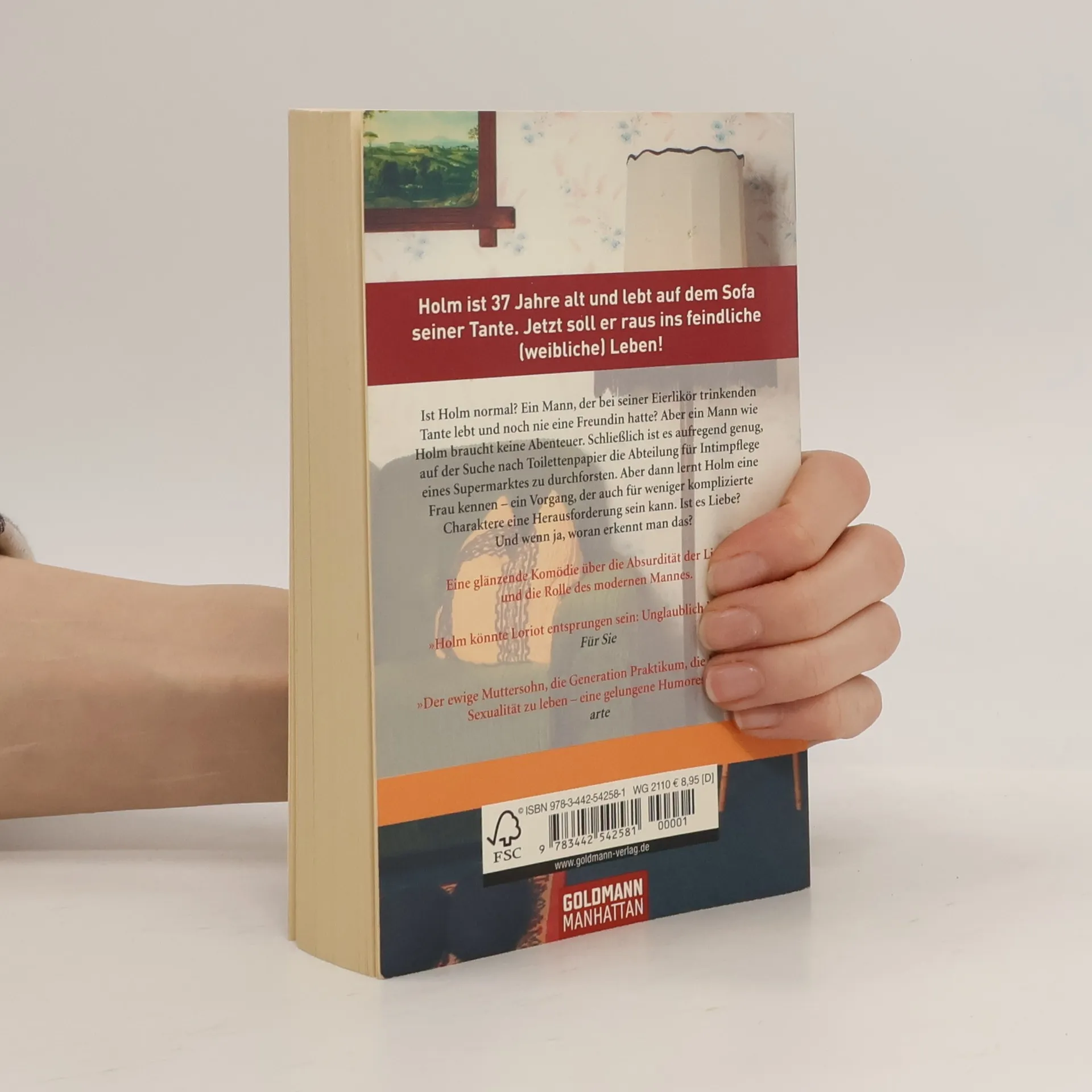 Holm ist 37 Jahre alt und lebt auf dem Sofa seiner Tante. Jetzt soll er raus ins feindliche (weibliche) Leben! Ist Holm normal? Ein Mann, der bei seiner Eierlikör trinkenden Tante lebt und noch nie eine Freundin hatte? Aber ein Mann wie Holm braucht keine Abenteuer. Schließlich ist es aufregend genug, auf der Suche nach Toilettenpapier die Abteilung für Intimpflege eines Supermarktes zu durchforsten. Aber dann lernt Holm eine Frau kennen – ein Vorgang, der auch für weniger komplizierte Charaktere eine Herausforderung sein kann. Ist es Liebe? Und wenn ja, woran erkennt man das? Eine glänzende Komödie über die Absurdität der Liebe.