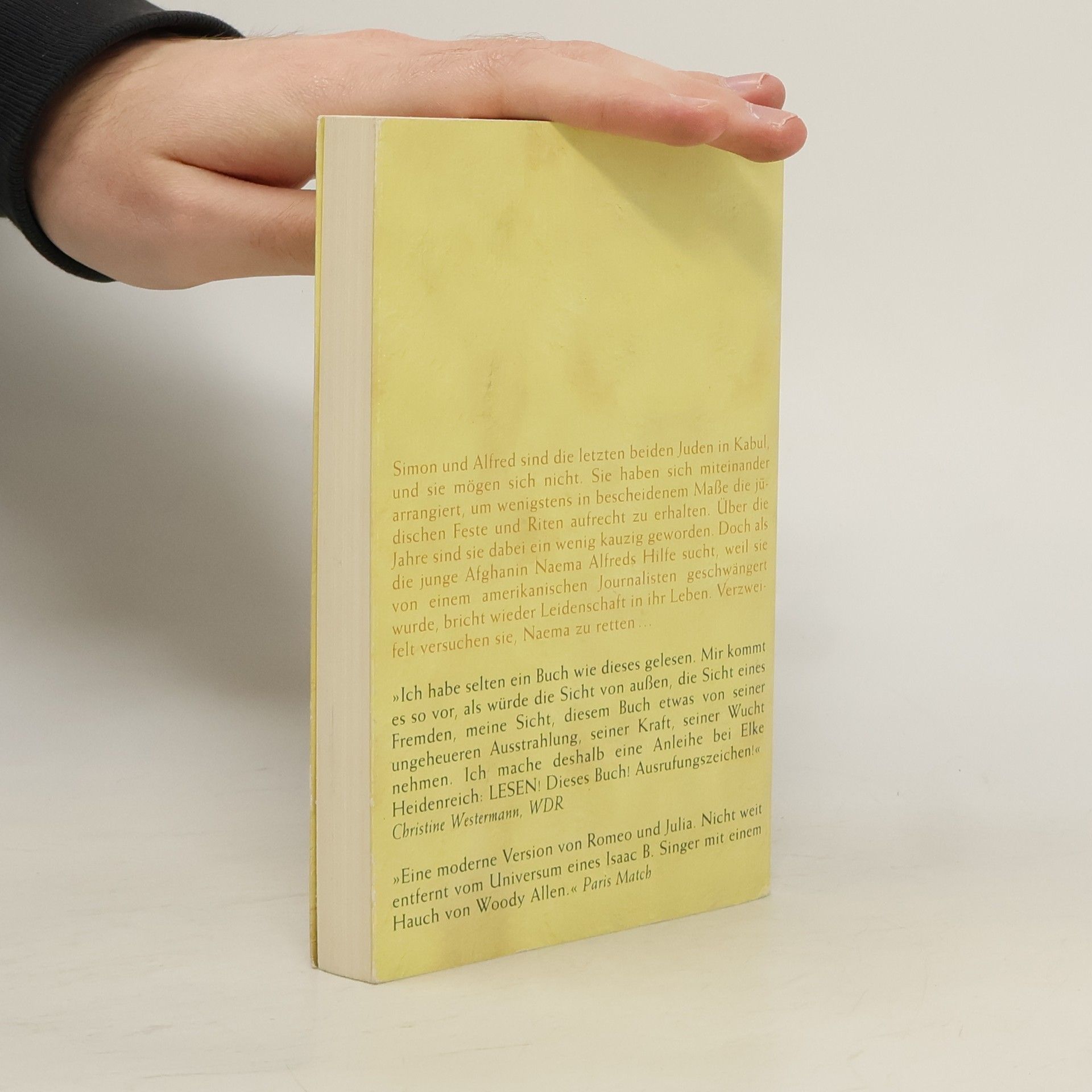Eine Geschichte über Freundschaft und Fanatismus, über die zarten Regungen und falschen Versprechen der Liebe. Simon und Alfred sind die letzten beiden Juden in Kabul, und sie mögen sich nicht. Sie haben sich miteinander arrangiert, um wenigstens im bescheidenen Maße die jüdischen Feste und Riten aufrecht zu erhalten. Von den zehn Juden, die es für eine Synagoge braucht, muss man sich die fehlenden acht dann einfach vorstellen. So sind sie über die Jahre ein wenig kauzig geworden. Erst als die junge Afghanin Naema, die von einem amerikanischen Journalisten geschwängert wurde, Alfreds Hilfe sucht, bricht auch bei ihnen wieder Leidenschaft ins Leben, und voller Aktionismus versuchen sie, Naema zu retten.