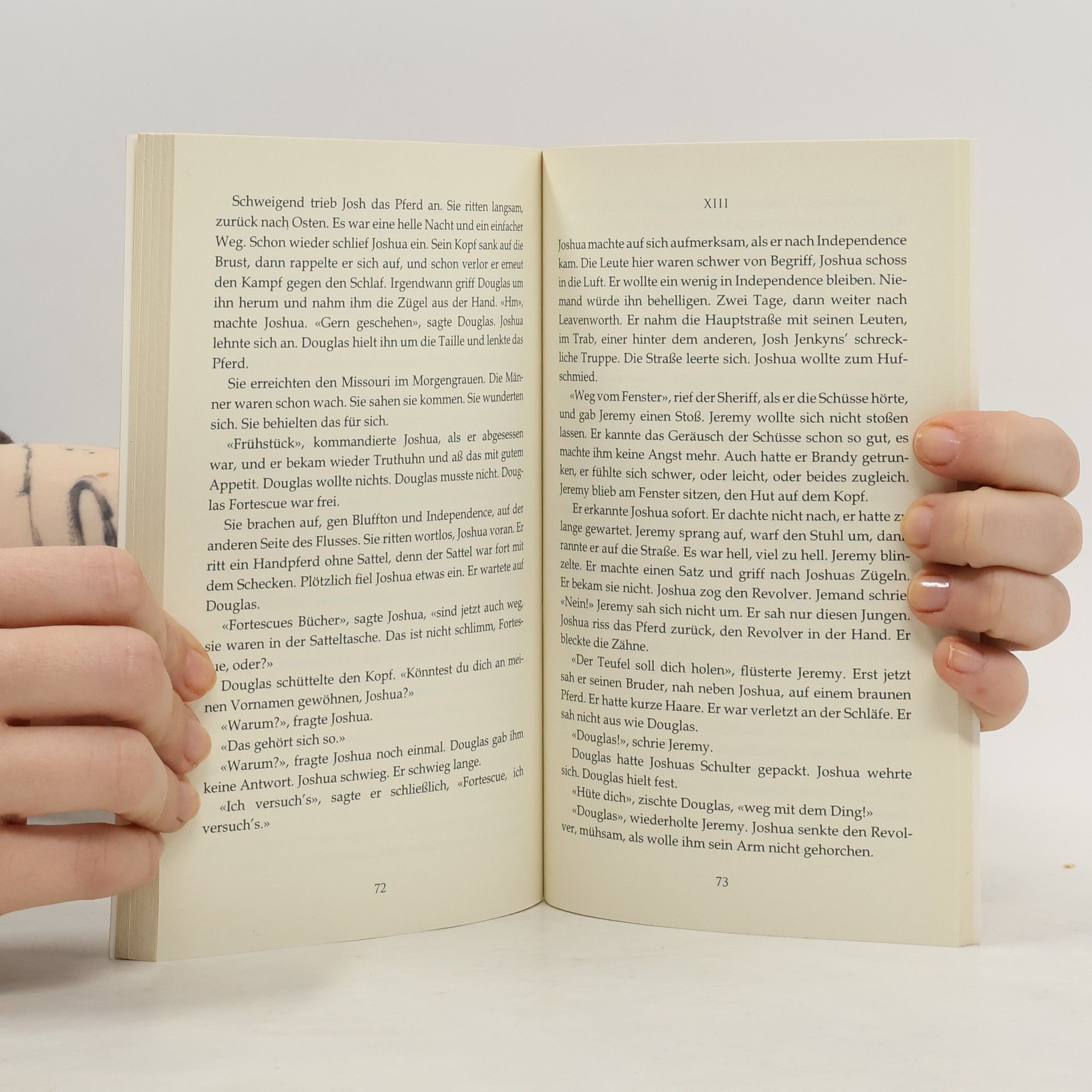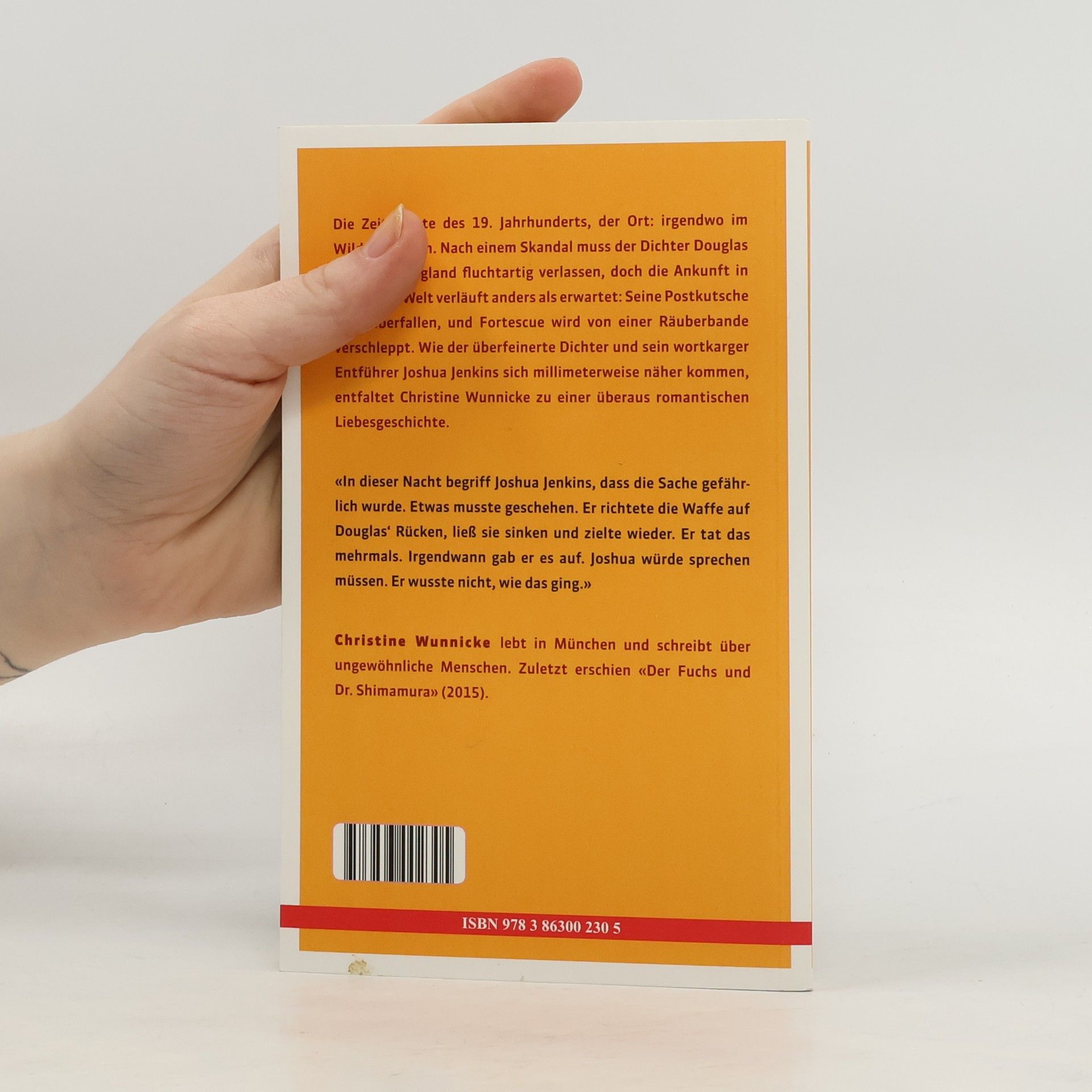 «Brokeback Mountain» hat mit seiner Mischung aus hartem Männerleben und schwuler Liebesgeschichte ein Millionenpublikum zu Tränen gerührt. Dabei wissen die deutschen Leser seit Karl May, welche erotischen Stimmungen nächtliche Ritte zu zweit erzeugen können. An diesen deutschen Blick auf den Wilden Westen knüpft die Erzählung «Missouri» an. Die Zeit: Mitte des 19. Jahrhunderts, der Ort: irgendwo im Wilden Westen. Der englische Dichter Douglas Fortescue und sein Bruder Jeremy sind mit der Postkutsche auf dem Weg in ein neues Leben, doch plötzlich überstürzen sich die Ereignisse: Die Kutsche wird überfallen, und Fortescue wird von einer Räuberbande verschleppt. Wie der überfeinerte Dichter und sein wortkarger Entführer Joshua Jenkins sich millimeterweise näher kommen, entfaltet Christine Wunnicke zu einer überaus romantischen Liebesgeschichte.