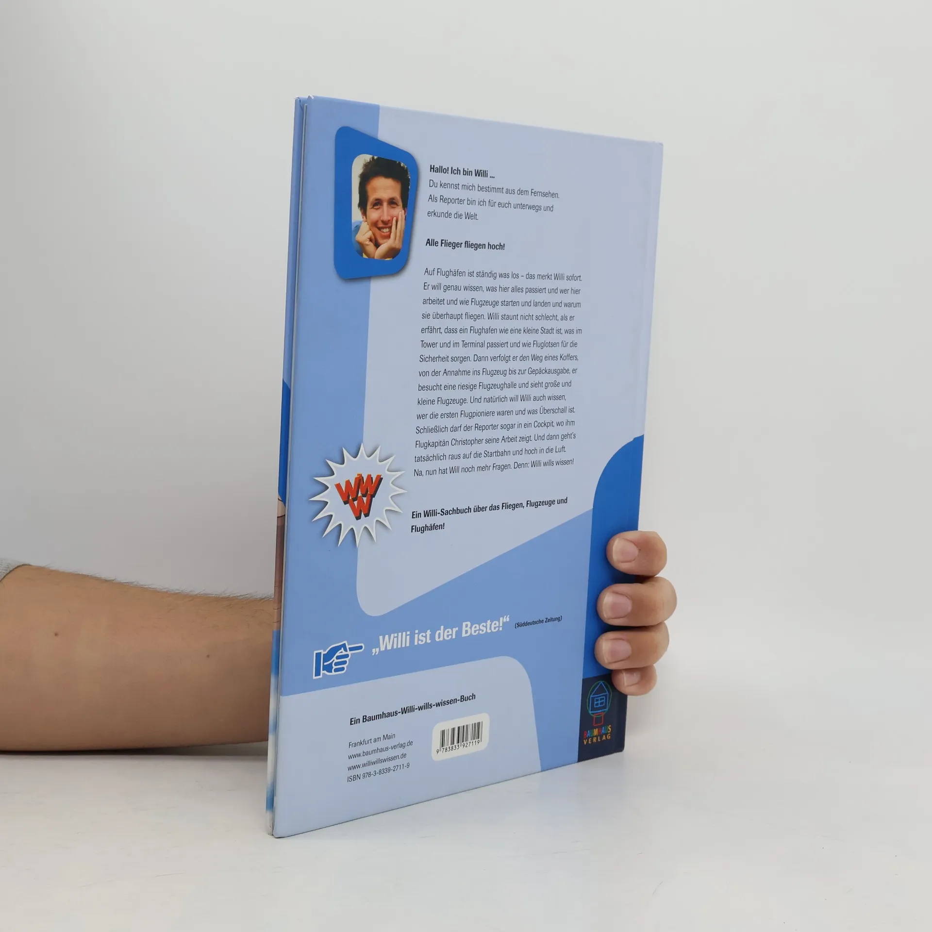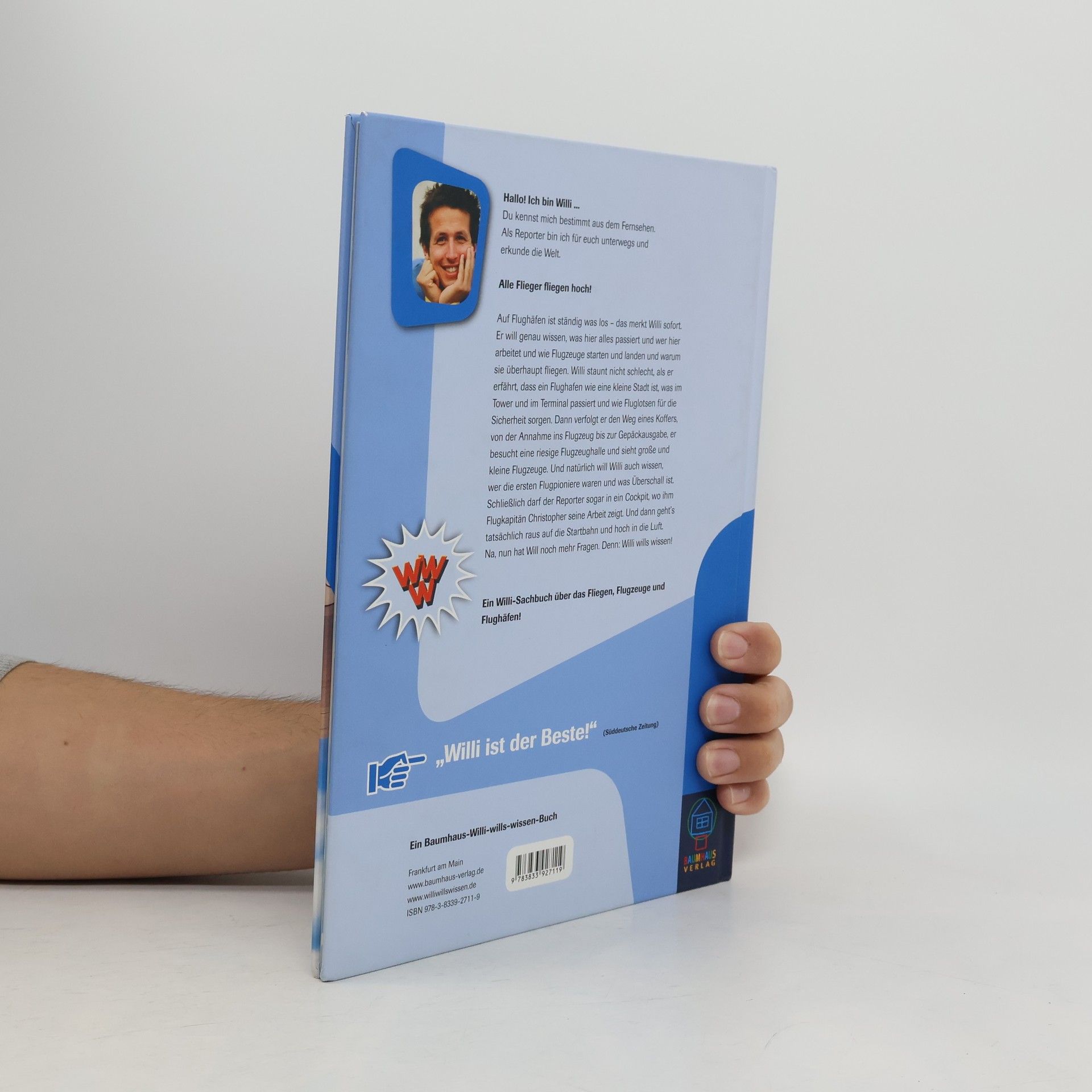 Auf dem Münchener Flughafen ist ständig was los. 1000 Flugzeuge starten und landen hier täglich! Für die Sicherheit sorgen Fluglotsen wie Mathias, der aus dem Tower über Funk mit den Piloten Kontakt hält. Mit dem Piloten Max dreht Willi in einer Cessna sogar ein paar Runden in der Luft. Später besucht unser Reporter den Flughafen Rhein-Main in Frankfurt. Hier hat Flugkapitän Christopher eine Überraschung - Willi darf mit nach Malta fliegen! Vorher fragt er sich: Warum fliegen Flugzeuge? Da ist Willi bei Klaus und Uwe richtig. Die Beiden sind Ingenieure und checken die Jets in der riesigen Werfthalle. Willi - Best- und Longseller im Buch und im TV Willi wills wissen ist eine der bekanntesten und erfolgreichsten Kindersendungen im deutschen Fernsehen! Willi wills wissen bietet allerbeste Informationen für Kinder! Willi wills wissen hat zahlreiche Auszeichnungen erhalten, u. a. den Erich-Kästner- Fernsehpreis, den Bayerischen Fernsehpreis und das Com enius-Siegel
