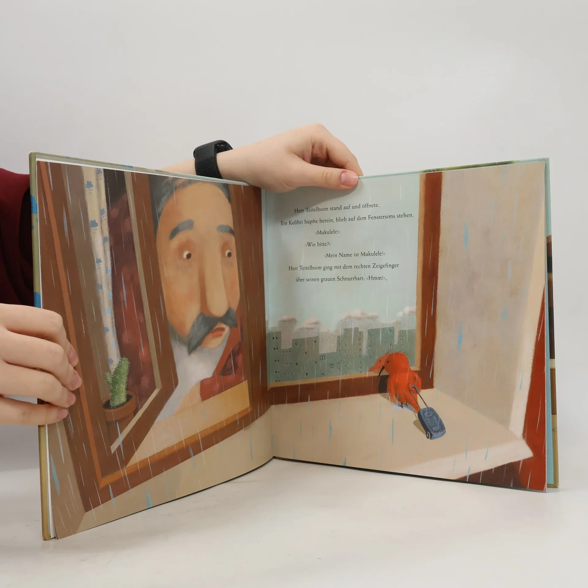 Was soll der kleine Kolibri in Teigelboims Wohnung? Wolodja Teigelboim bleibt an diesem regnerischen Sonntag im Bett liegen und lässt seine Uhren Uhren sein. Da klopft ein Kolibri ans Fenster. Unter vielen Vorwänden will der kleine rote Vogel bleiben. Teigelboim braucht aber keinen Kolibri. Mukulele bringt immer neue Gründe und nennt Vorzüge, warum er Teigelboim nützlich sein könnte. Schliesslich lenkt Teigelboim ein und schlägt einen Spaziergang im Freien vor. Die lustigen und hübschen Bilder zeigen Teigelboims Wohnung in vielen Details. Die merkwürdige Geschichte wirft mehr Fragen als Antworten auf. Sie arbeitet fantasieanregend. Ab 4 Jahren, gut, Ruedi W. Schweizer.