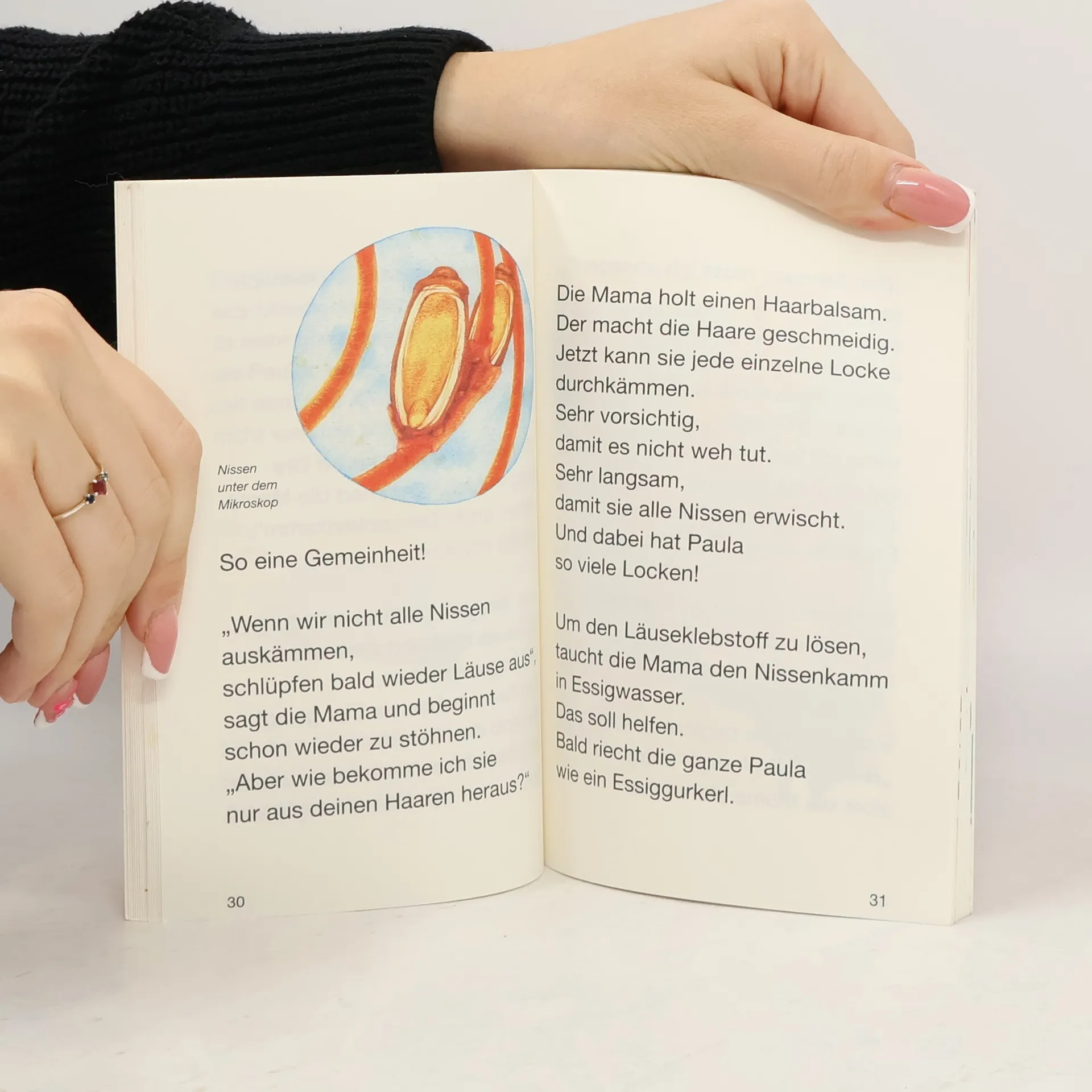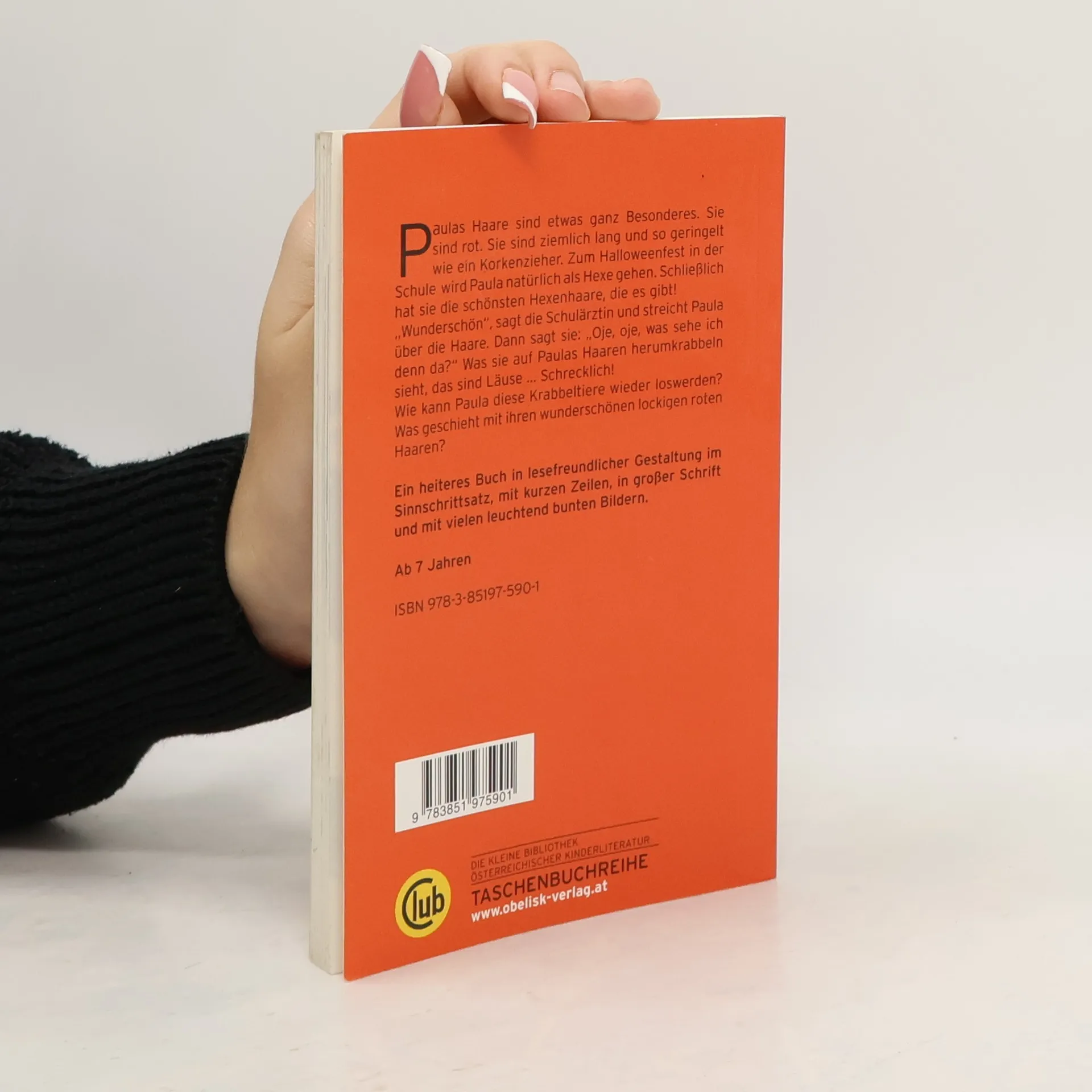 Paulas Haare sind etwas ganz Besonderes. Sie sind rot. Sie sind ziemlich lang. Und sie sind so geringelt wie ein Korkenzieher. Zweimal in der Woche wäscht Paula ihre Haare. Am Sonntag und am Mittwoch. Mit Kindershampoo, damit es nicht in den Augen brennt. Natürlich brennt es trotzdem. Danach kämmt die Mama Paulas Haare vorsichtig durch. Mit einem Lockenkamm, damit es nicht weh tut. Zum Halloweenfest in der Schule wird Paula natürlich als Hexe gehen. Schließlich hat sie die schönsten Hexenhaare, die es gibt! „Wunderschön“, sagt die Schulärztin und streicht Paula über die Haare. Dann sagt sie: „Oje, oje, was sehe ich denn da?“ Was sie auf Lauras Haaren herumkrabbeln sieht, das sind Läuse. Schrecklich! Wie kann Laura diese Krabbeltiere wieder loswerden? Was geschieht jetzt mit ihren wunderschönen lockigen roten Haaren? Wie Laura und ihre Mutter diesen harten Kampf gegen dieses Ungeziefer mit guter Laune durchstehen, das erzählt dieses heitere Buch. Es macht Kindern Mut, die in der gleichen Lage wie Paula sind. Die lesefreundliche grafische Gestaltung im Sinnschrittsatz mit kurzen Zeilen und großer Schrift und den vielen leuchtend bunten Bildern wir Leseanfänger sicher zum Lesen verlocken!