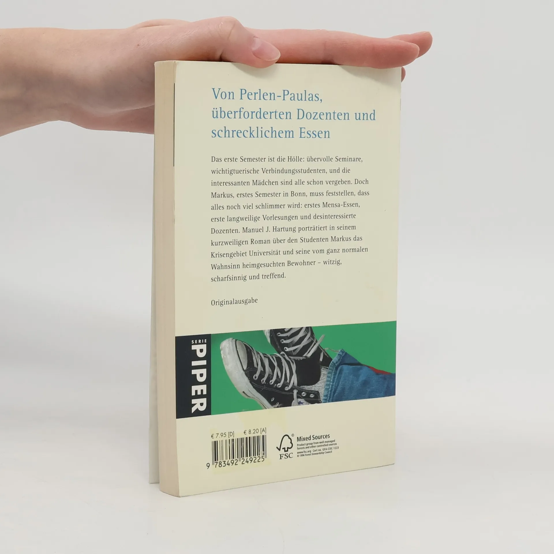 Das erste Semester ist die Hölle: übervolle Seminare, wichtigtuerische Verbindungsstudenten, und die interessanten Mädchen sind alle schon vergeben. Doch Markus, erstes Semester in Bonn, muss feststellen, es wird alles noch viel schlimmer: erstes Mensa-Essen, erste langweilige Vorlesungen und überforderte Dozenten. Manuel J. Hartung porträtiert in seinem kurzweiligen Roman über den Studenten Markus das Krisengebiet Universität und seine vom ganz normalen Wahnsinn heimgesuchten Bewohner – witzig, scharfsinnig und treffend.