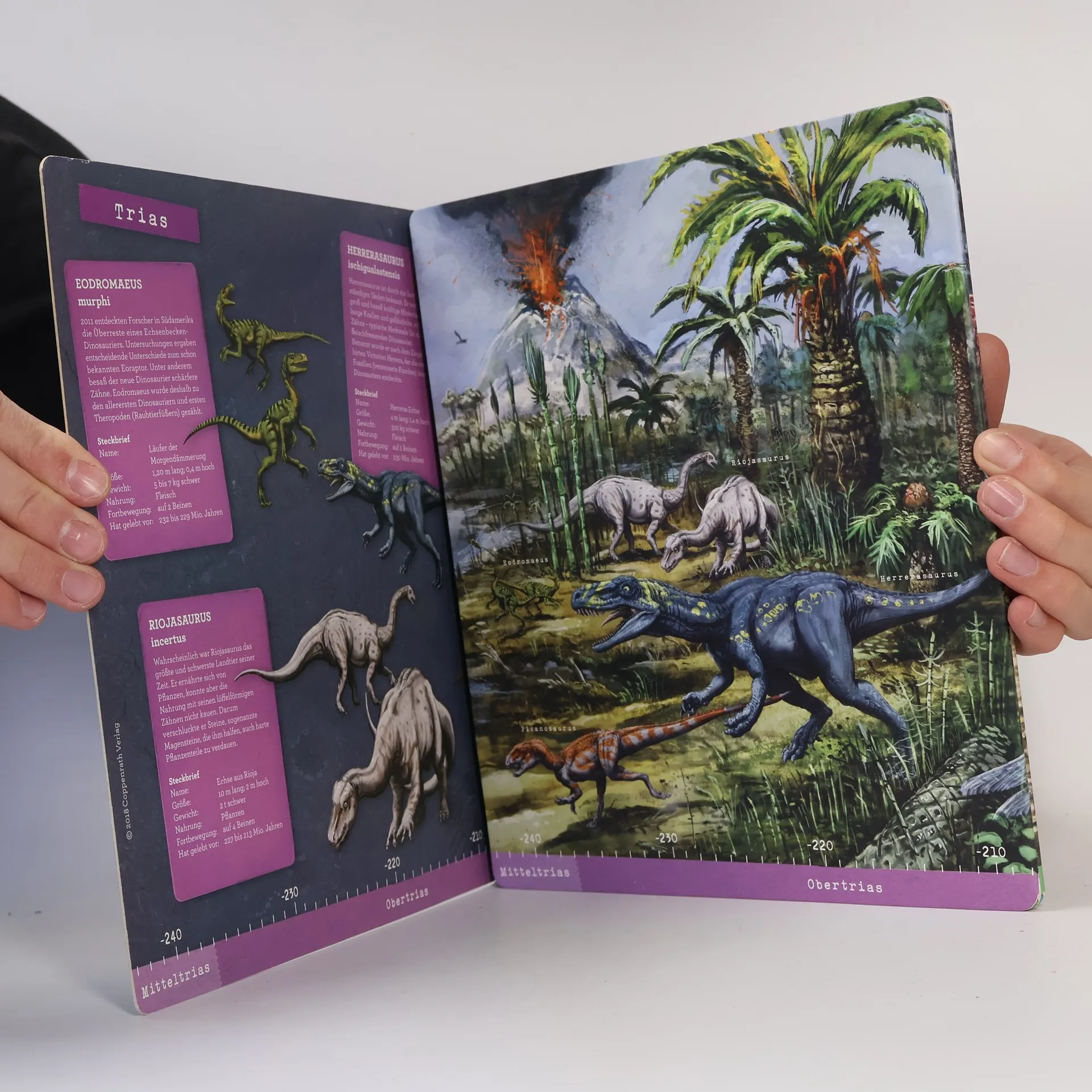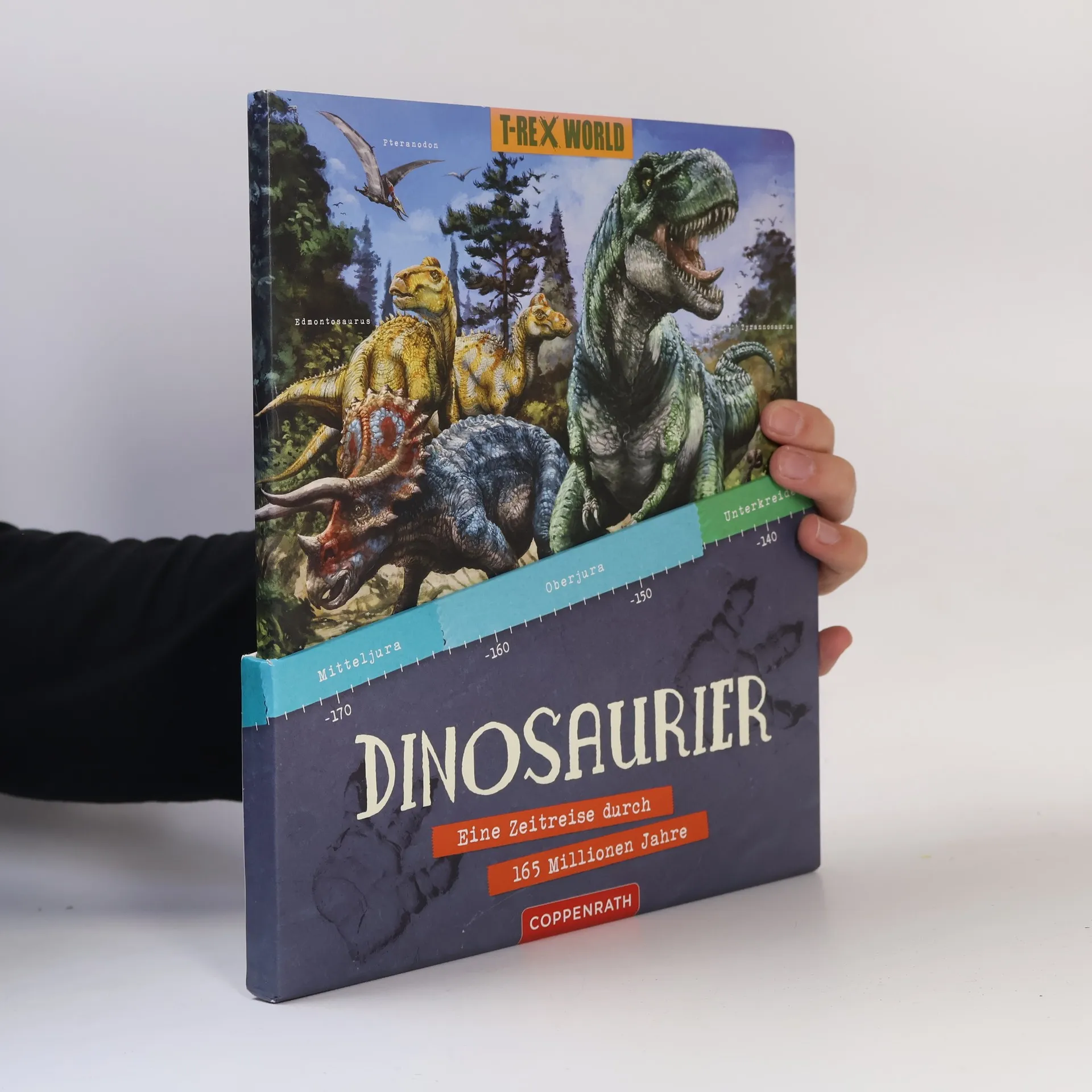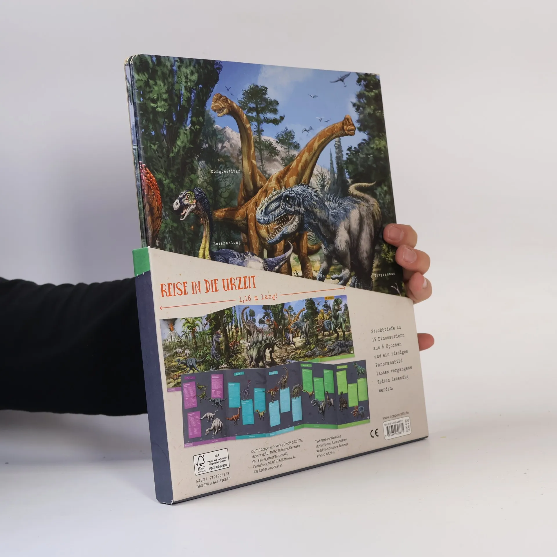 Steckbriefe zu 15 Dinosauriern aus 6 Epochen und ein riesiges Panoramabild lassen vergangene Zeiten lebendig werden. Ein 1,16 m langes Leporello im stabilen Schuber.