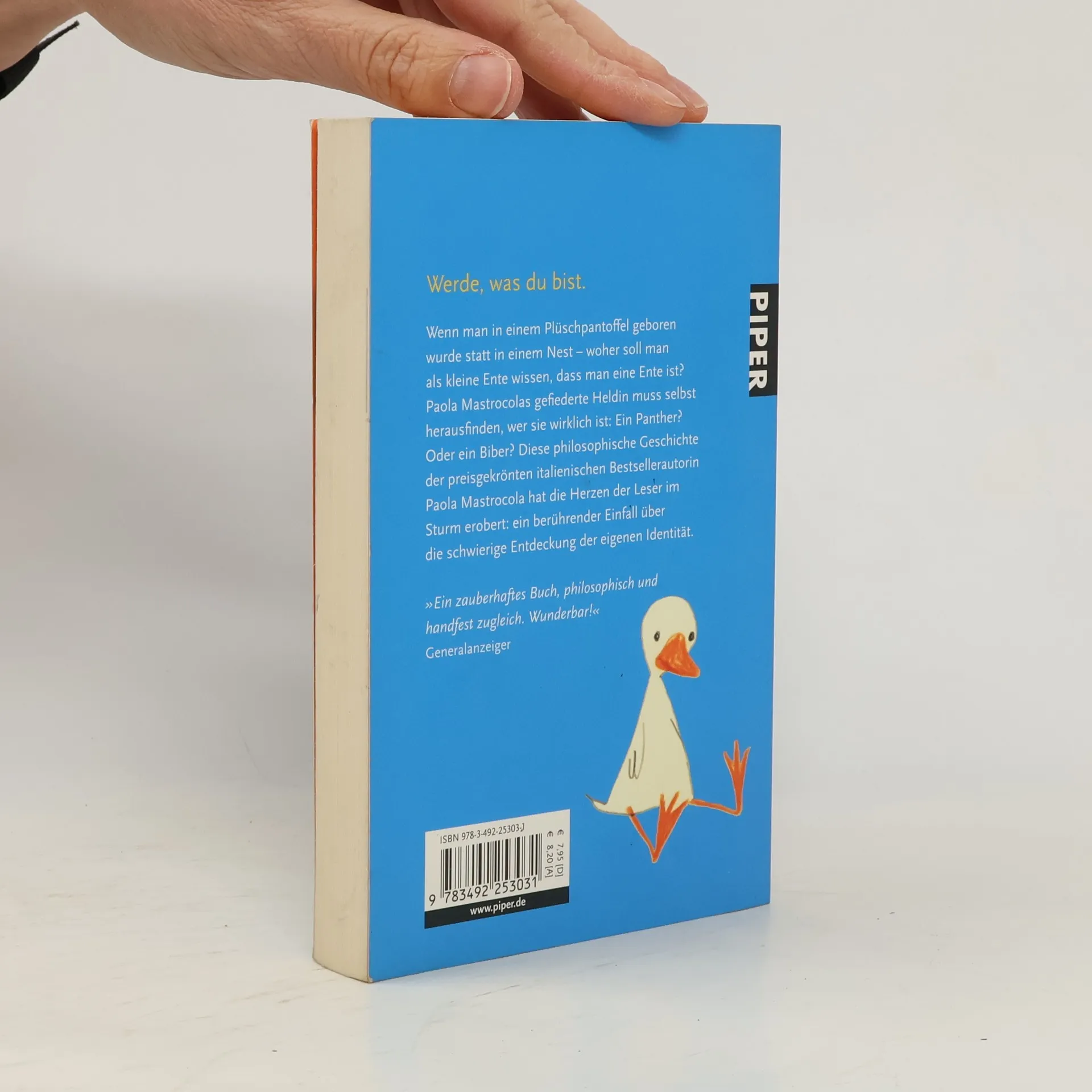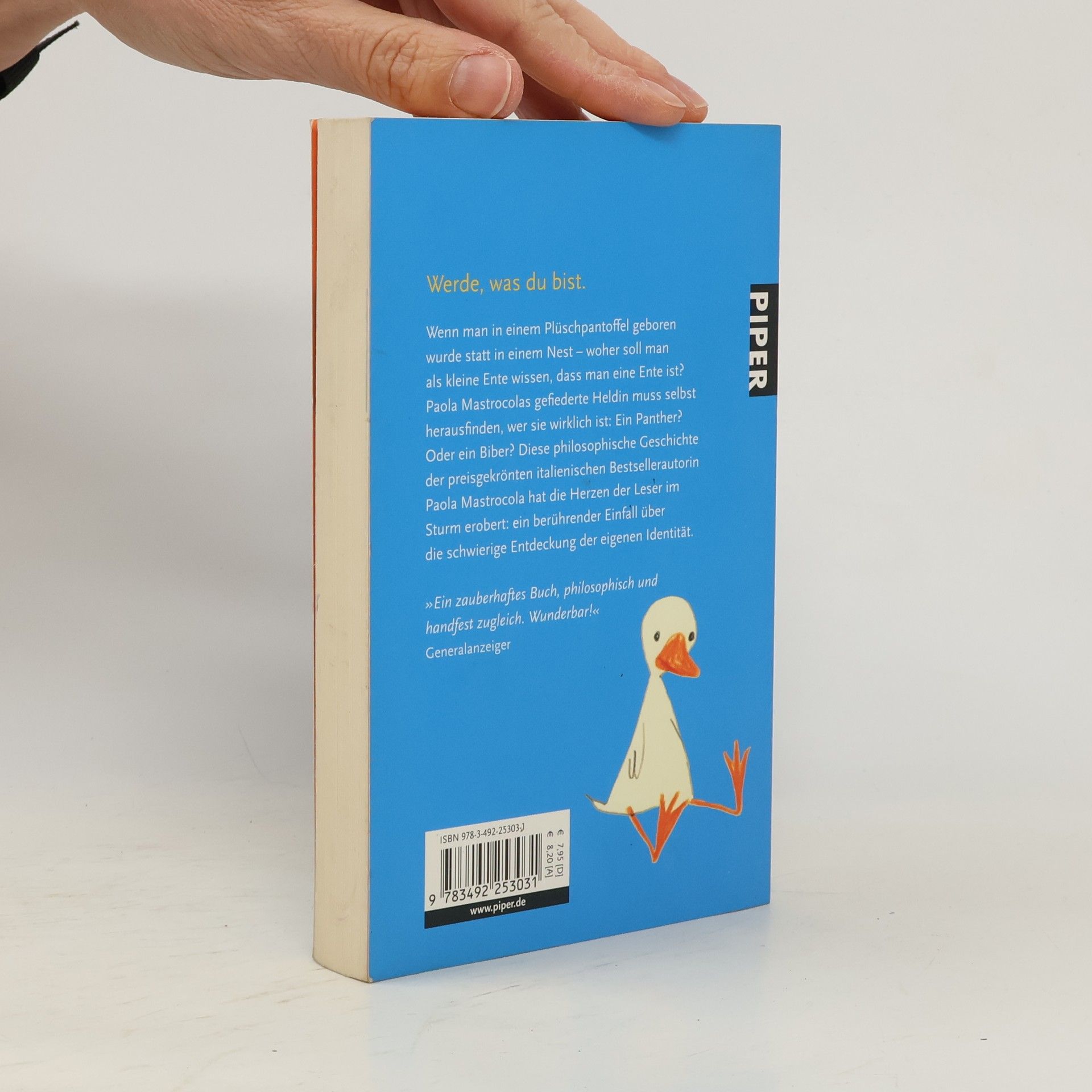 Wenn man in einem Plüschpantoffel geboren wurde statt in einem Nest – woher soll man als kleine Ente wissen, dass man eine Ente ist? Paola Mastrocolas kleine gefiederte Heldin muss selbst herausfinden, wer sie wirklich ist: Ein Panther? Oder ein Biber? Das philosophische Märchen der preisgekrönten italienischen Bestsellerautorin Paola Mastrocola hat die Herzen der Leser im Sturm erobert: eine zauberhafte Geschichte über die schwierige Entdeckung der eigenen Identität.