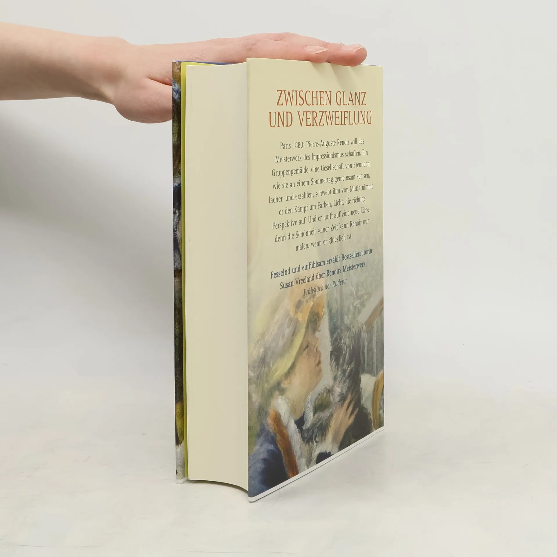 Ein neuer Roman von Susan Vreeland über einen großen Maler und ein geniales Meisterwerk Als der Schriftsteller Emile Zola bemängelt, es gebe unter den impressionistischen Gemälden kein Meisterwerk, ist der Ehrgeiz von Pierre-Auguste Renoir geweckt. Leidenschaftlich geht er ans Werk. Doch Renoir hat kaum Geld für Farben, der Sommer ist weit fortgeschritten, die Terrasse der Maison Fournaise steht ihm nur an acht Sonntagen zur Verfügung. Auch muss er ehemalige Geliebte, deren eifersüchtige Ehemänner und längst zerstrittene Freunde überzeugen, für ihn Modell zu stehen. Mehrere Male droht Renoir zu scheitern: am Malen einer Figur, an einer seiner kapriziösen Damen. In seinen freien Momenten rudert er mit der jungen Witwe Alphonsine Fournaise auf der Seine und öffnet ihr sein Herz. Doch sie ist nicht die Einzige, die den empfindsamen Maler für sich gewinnen möchte.